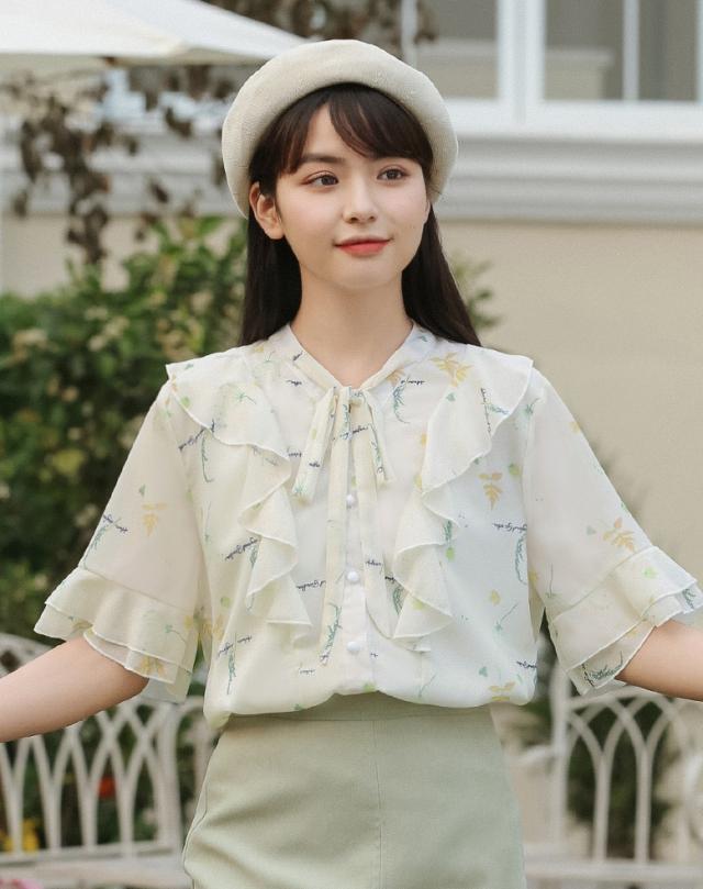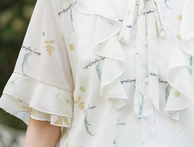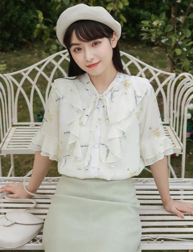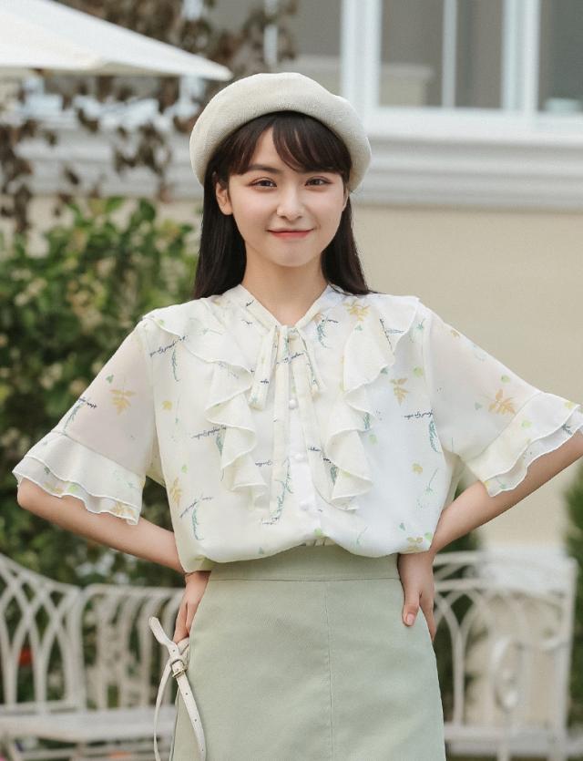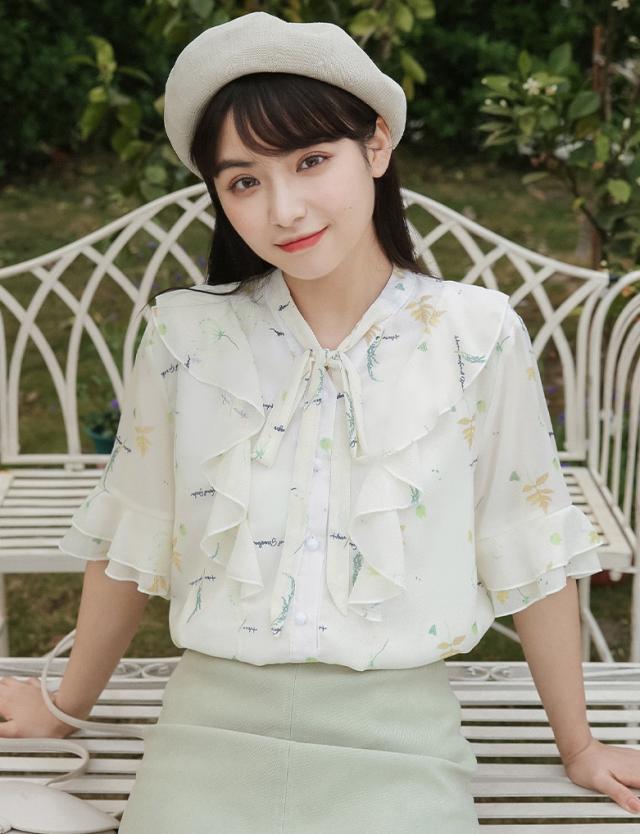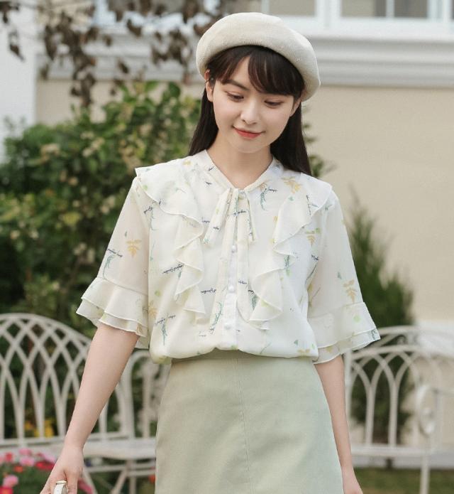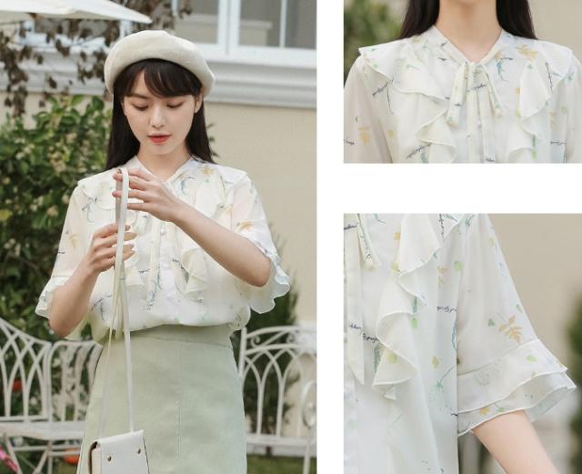 フラワープリントフリルブラウス トップス ブラウス 袖あり 半袖 シフォン フリル リボン ポリエステル かわいい 大人可愛い シンプル カジュアル おしゃれ お洒落 ラブリー キュート ガーリー 個性的 主役級 柄 フラワー 春 夏 10代 20代 30代 レディース OL 通勤 学生 通学 デート お出かけ 女子会 休日 着回し 普段使い 重ね着 韓国 韓国系 サイズ S M L 色展開 白 ホワイト
