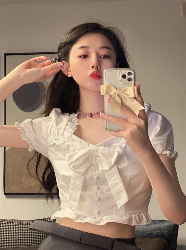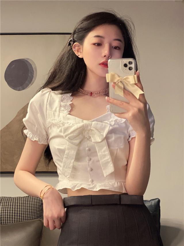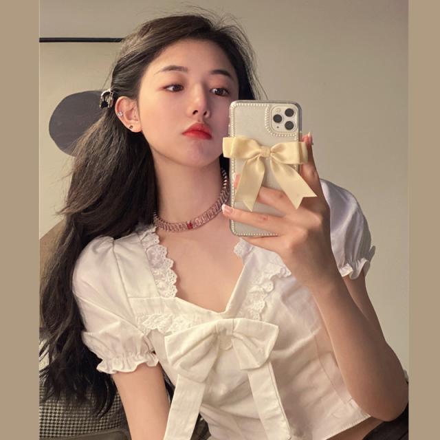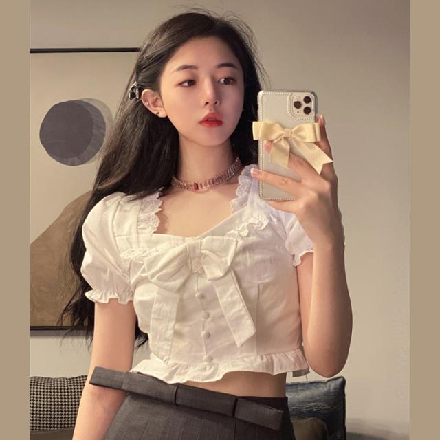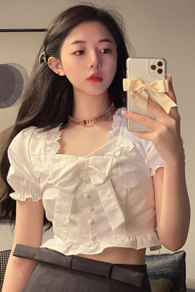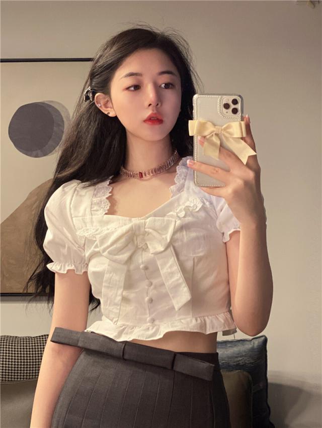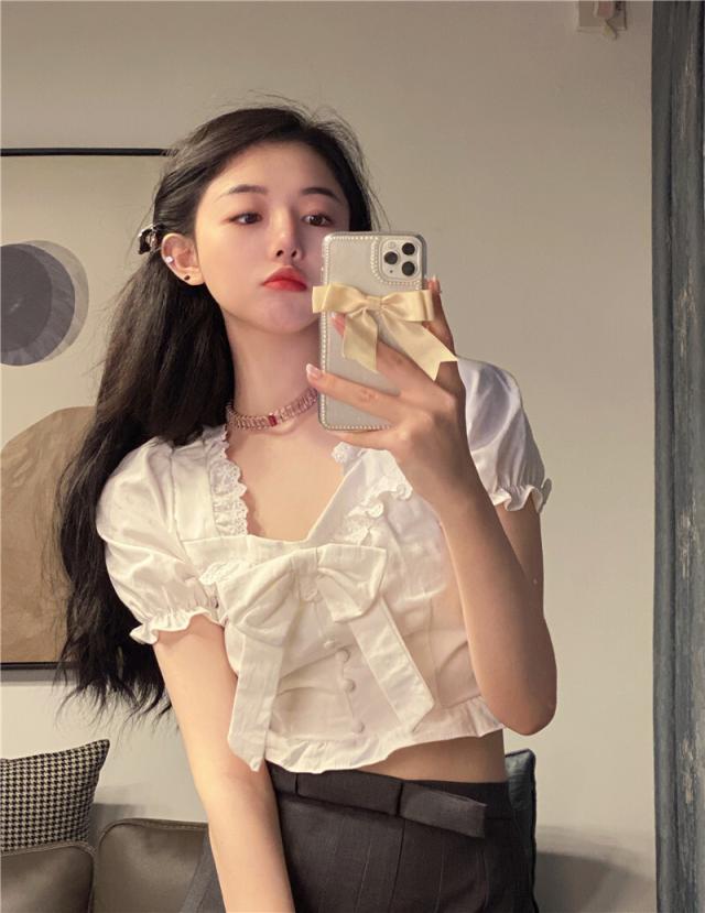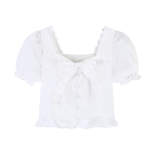 トップス レディース ブラウス フリル レース リボン ブルス ショート丈 半袖 パフスリーブ スクエアネック 無地 かわいい 大人 シンプル カジュアル おしゃれ ラブリー キュート ガーリー 主役級 お出かけ ランチ デート 女子会 旅行 お泊まり 休日 韓国 オルチャン