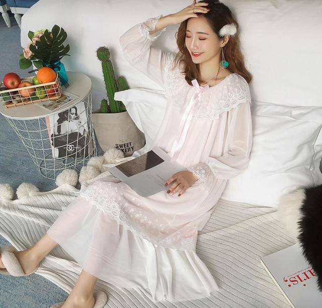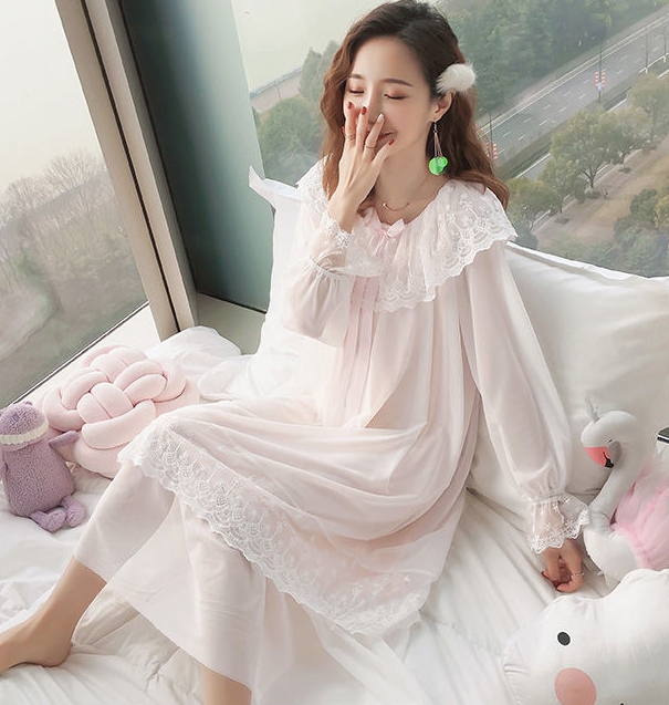 レースフリルワンピース ルームウェア パジャマ 寝巻き ナイトウェア ネグリジェ ロング ロング丈 袖あり 長袖 パフスリーブ 萌袖 ラウンドネック レース フリル リボン 透け感 シースルー 綿 かわいい 大人可愛い シンプル カジュアル おしゃれ お洒落 大人可愛い 大人女子 ラブリー キュート ガーリー 無地 柄 春 夏 秋 10代 20代 30代 レディース 女子会 お泊まり 休日 普段使い 韓国 韓国系 ゆったり ゆる 色展開 白 ホワイト ピンク
