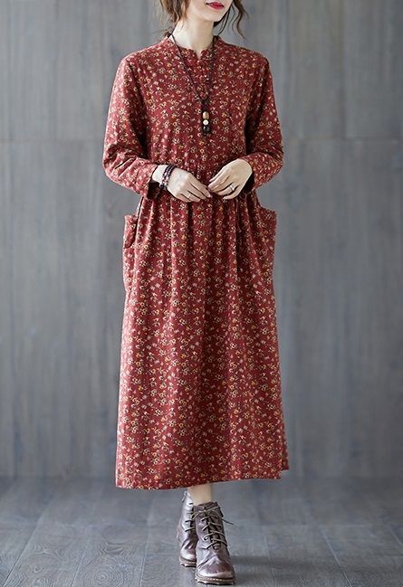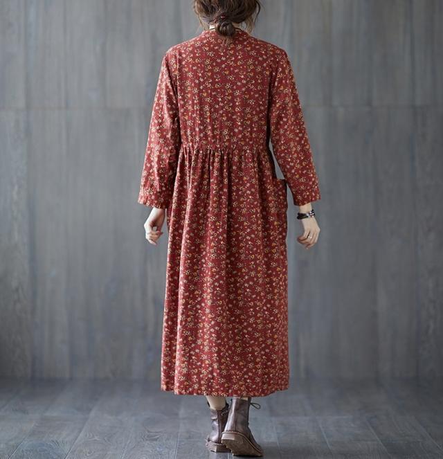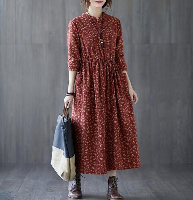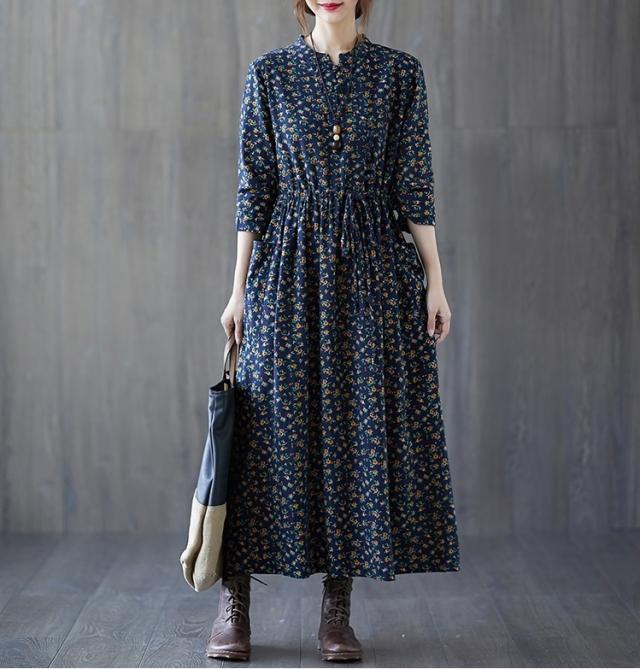 綿 麻 ワンピース コットン リネン 小花柄 総花柄 フローラル 長袖 袖あり 襟なし ハイウエスト 切り替え ロング丈 ロング ミモレ丈 膝下 ひざ下 ポケット付き 大人 カジュアル 大人可愛い かわいい 可愛い 大人女子 おしゃれ お洒落 通勤 通学 お出かけ デート 旅行 休日 普段着 普段使い 20代 30代 レディース 春 秋 大きいサイズ M L XL 2XL ネイビー 紺 ブリックレッド 赤
