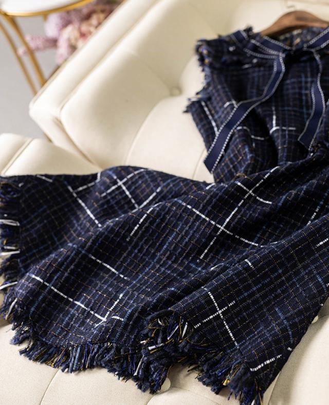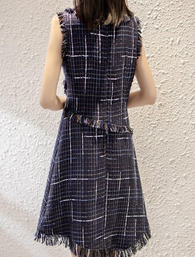 ツイード ワンピース ノースリーブ ミニ ショート丈 リボン フリンジ クルーネック ラウンドネック Aライン 切り替えデザイン ファスナー ネイビー アシンメトリー かわいい 大人 きれいめ 上品 おしゃれ レトロ お出かけ ディナー ランチ パーティー 二次会 結婚式 お出かけ