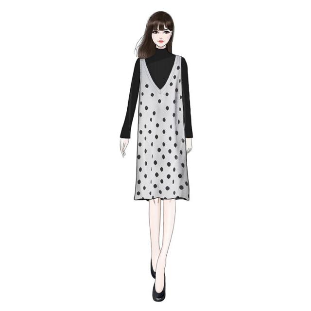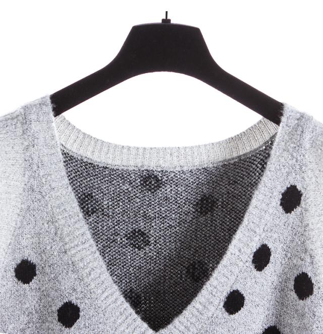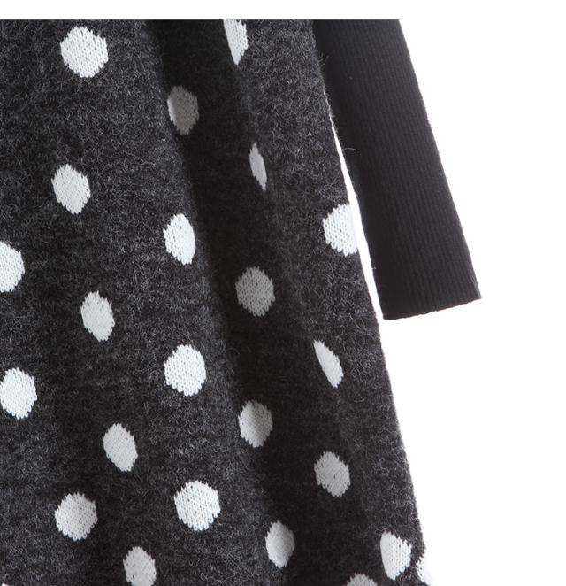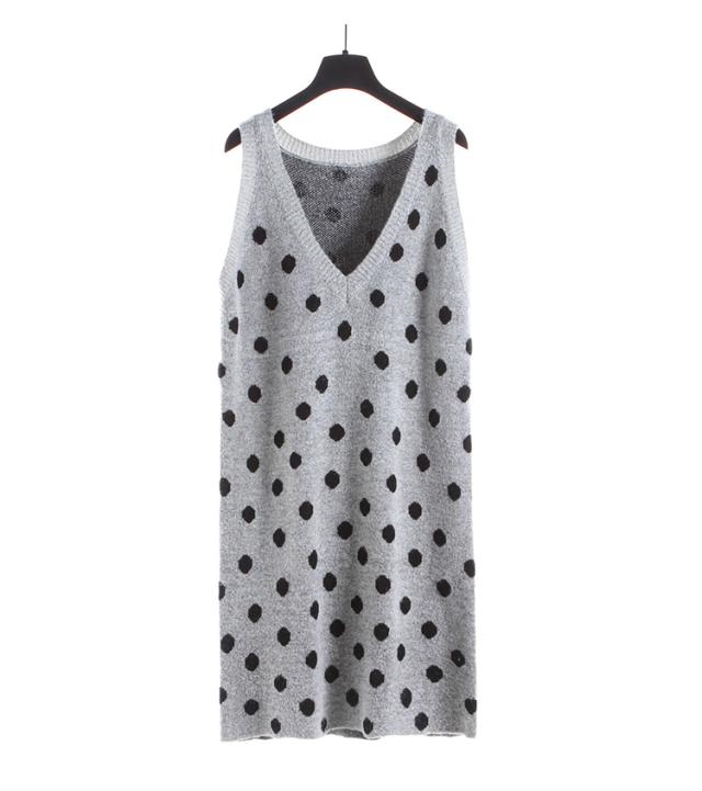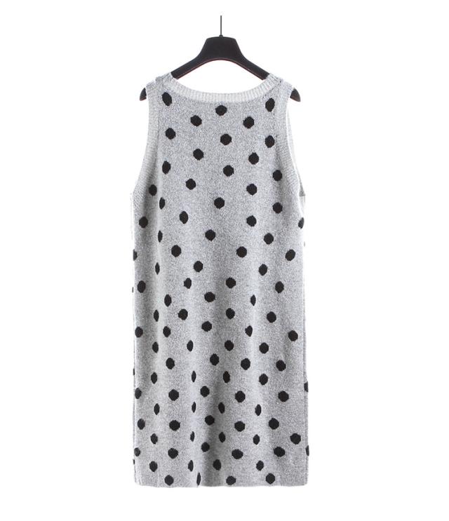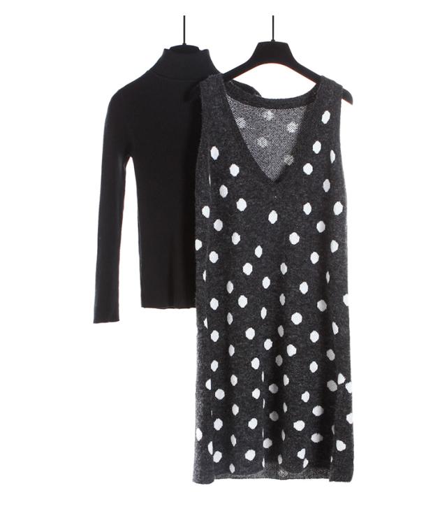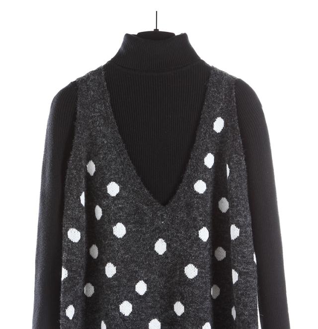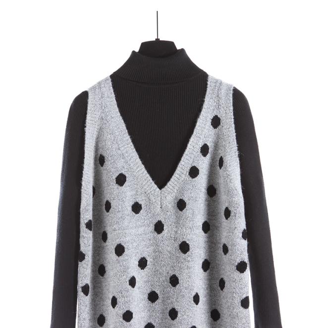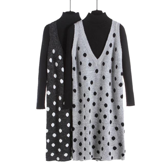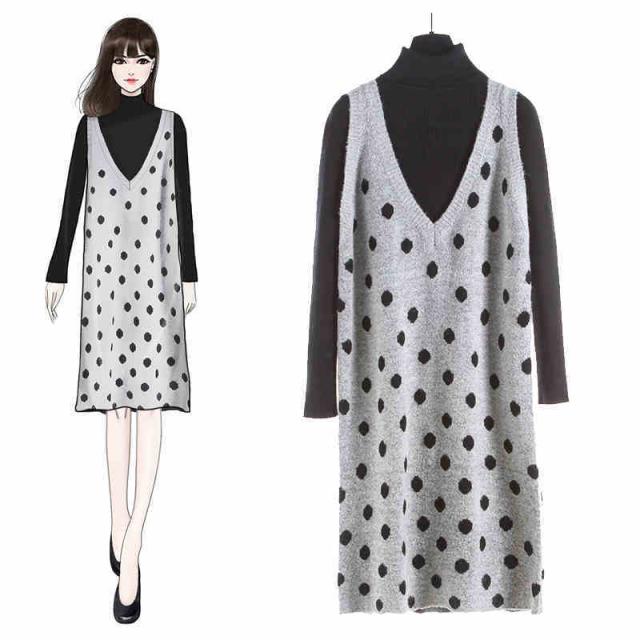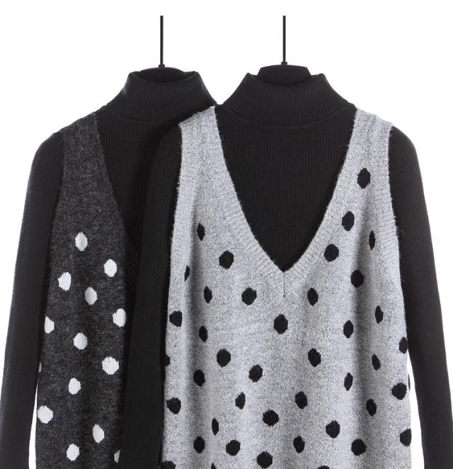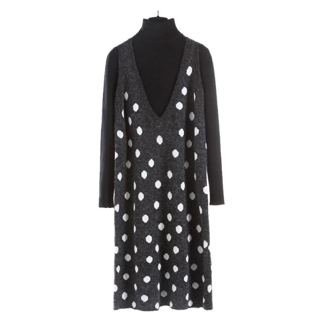 2点セット セットアップ リブ ニット セーター ワンピース ツーピース 長袖 袖あり ハイネック ドット柄 水玉 Vネック 膝丈 ひざ丈 袖なし 大人 ガーリー 大人可愛い かわいい 可愛い 大人女子 おしゃれ お洒落 通勤 通学 学生 お出かけ デート 旅行 休日 普段着 普段使い 着回し重ね着 レイヤード コーデ レディース 10代 20代 春 秋 ワンサイズ S グレー 灰色 ブラック 黒