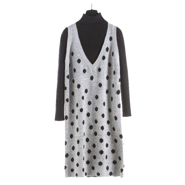 2点セット セットアップ リブ ニット セーター ワンピース ツーピース 長袖 袖あり ハイネック ドット柄 水玉 Vネック 膝丈 ひざ丈 袖なし 大人 ガーリー 大人可愛い かわいい 可愛い 大人女子 おしゃれ お洒落 通勤 通学 学生 お出かけ デート 旅行 休日 普段着 普段使い 着