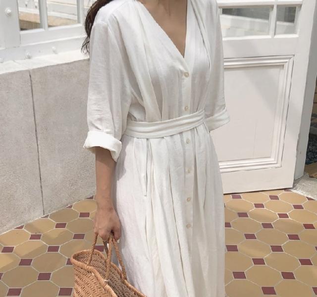 レディース Vネック シャツ ワンピース 人気 ロング マキシ丈 袖あり 長袖 Vネック Aライン ウエスト マーク ウエストリボン 前開き 綿 麻 リネン 大人 可愛い きれいめ シンプル カジュアル おしゃれ 女の子 こなれ感 無地 白 黒 10代 20代 30代 普段着 通学 イベント