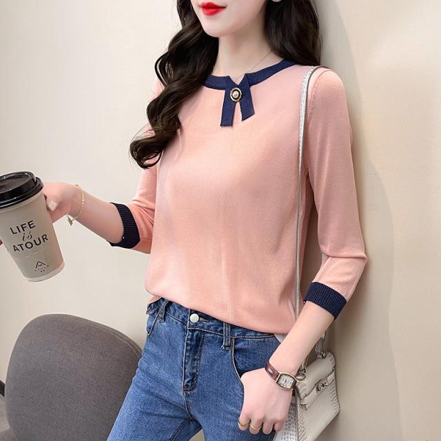 セーター レディース トップス ニット 七分袖 サマーニット ラウンドネック パール バイカラー ビジュー 無地 薄手 シンプル カジュアル ゆったり 大人 かわいい おしゃれ 通勤 オフィス OL お出かけ デート 女子会 ランチ ディナー 休日 普段着 普段使い 着回し ワンサイズ