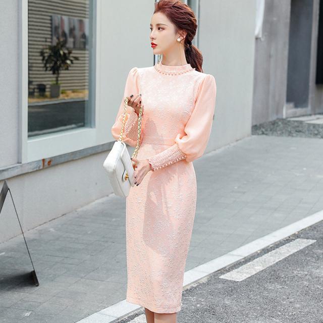 ドレス パーティードレス 結婚式ドレス 二次会ドレス 膝丈ドレス キャバドレス キャバ ワンピ タイトドレス 膝丈 ひざ丈 袖あり 長袖 ランタンスリーブ ハイネック ボトルネック Iライン タイト 切り替えデザイン レース ウエストマーク バックスリット パール かわいい 大人可愛い きれいめ 上品 おしゃれ お洒落 エレガント 華やか 20代 30代 レディース ママ パーティー イベント ホテル ガーデン レストラン 韓国 オルチャン 美脚 脚長 二次会 お呼ばれ S M L XL ピンク