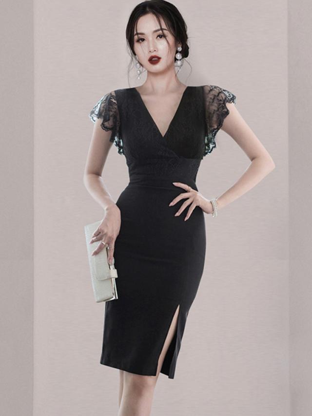 ドレス dress パーティードレス 結婚式ドレス 二次会ドレス 膝丈ドレス キャバドレス キャバ ワンピ タイトドレス 膝丈 ひざ丈 半袖 フレンチスリーブ Vネック Iライン タイト 切り替えデザイン レース ウエストマーク サイドスリット 透け感 かわいい 大人可愛い きれいめ 上品 おしゃれ お洒落 エレガント 華やか 無地 20代 30代 レディース ママ パーティー イベント ホテル ガーデン レストラン 韓国 オルチャン 美脚 脚長 二次会 お呼ばれ S M L XL ブラック