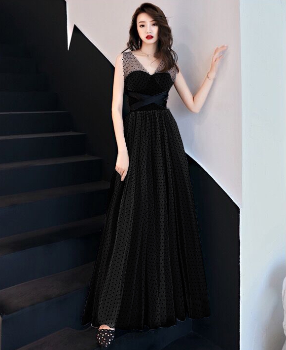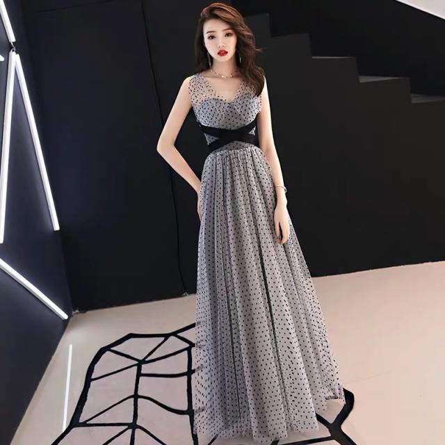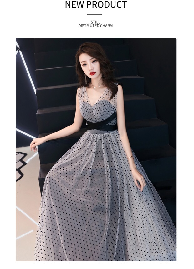 ロング ドレス ドット柄 ワンピース マキシ ノースリーブ シースルー 透け感 切り替えデザイン バイカラー Aライン フレア チュール シフォン バックコンシャス リボン かわいい きれいめ おしゃれ エレガント パーティー 二次会 発表会 音楽会 舞台衣装 ブラック グレー