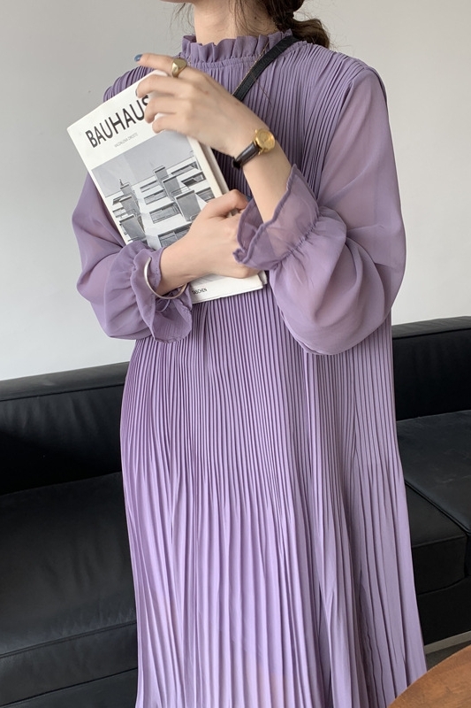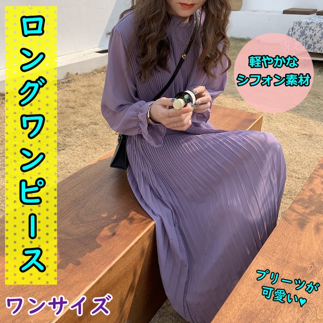 シフォンプリーツワンピース ワンピース フレアワンピース ロング ロング丈 マキシ マキシ丈 袖あり 長袖 パフスリーブ ハイネック フレア プリーツ フリル かわいい 大人可愛い きれいめ シンプル カジュアル 大人 おしゃれ お洒落 大人可愛い 大人女子 こなれ感 ラブリー キュート ガーリー 主役級 無地 春 夏 秋 10代 20代 30代 レディース 学生 通学 デート お出かけ 公園デビュー 女子会 休日 着回し 普段使い 重ね着 韓国 韓国系 紫 パープル アプリコット