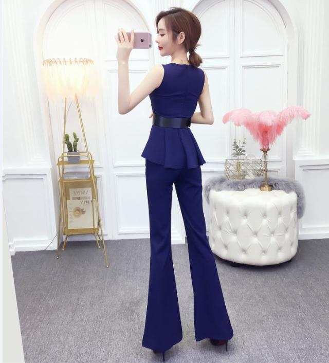 セットアップ 2色 トップス ボトムス ノースリーブ Vネック ペプラム フリル ベルト フレアパンツ ロング丈 切り替えデザイン ウエストマーク スリット 上下 2点 かわいい きれいめ シンプル 大人 上品 おしゃれ エレガント 無地 OL 通勤 オフィス パーティー 二次会 結婚式