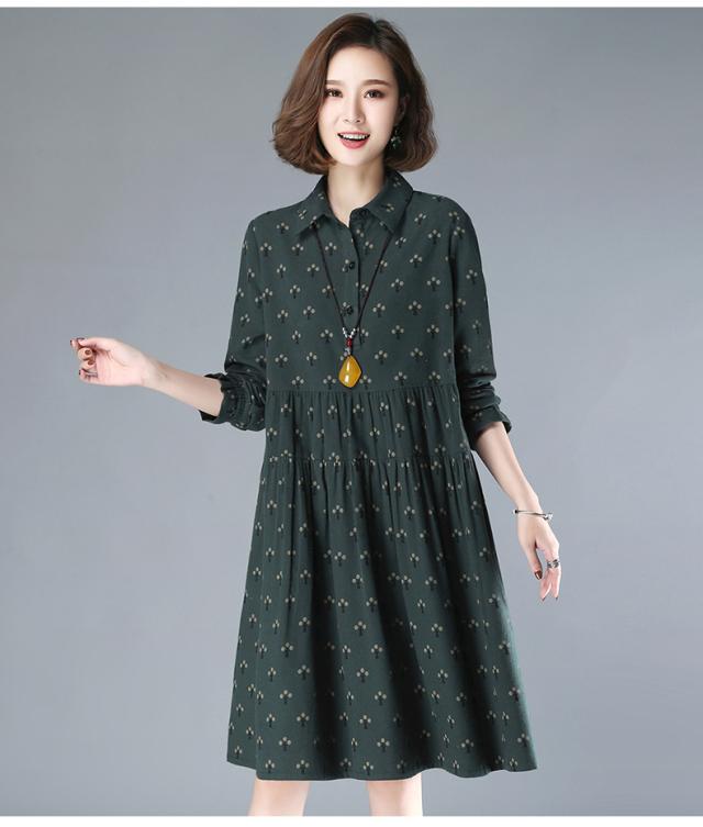 花柄ワンピース ワンピース シャツワンピース 膝下 ミディアム丈 長袖 襟付き レトロ柄 春 秋 冬 10代 20代 30代 40代 レディース 通勤 通学 お出かけ 休日 普段使い M L XL 2XL 3XL ダークグリーン グレー オレンジ