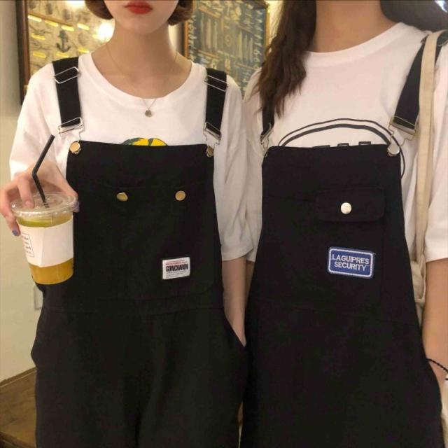 サロペット ジャンパースカート オールインワン スカート ボトムス ワンピース ボタン ワッペン 体型カバー ラフ カジュアル シンプル おしゃれ こなれ感 かわいい ボーイッシュ 無地 ブラック ベーシック お出かけ デート 女子会 旅行 着回し 普段使い オールシーズン
