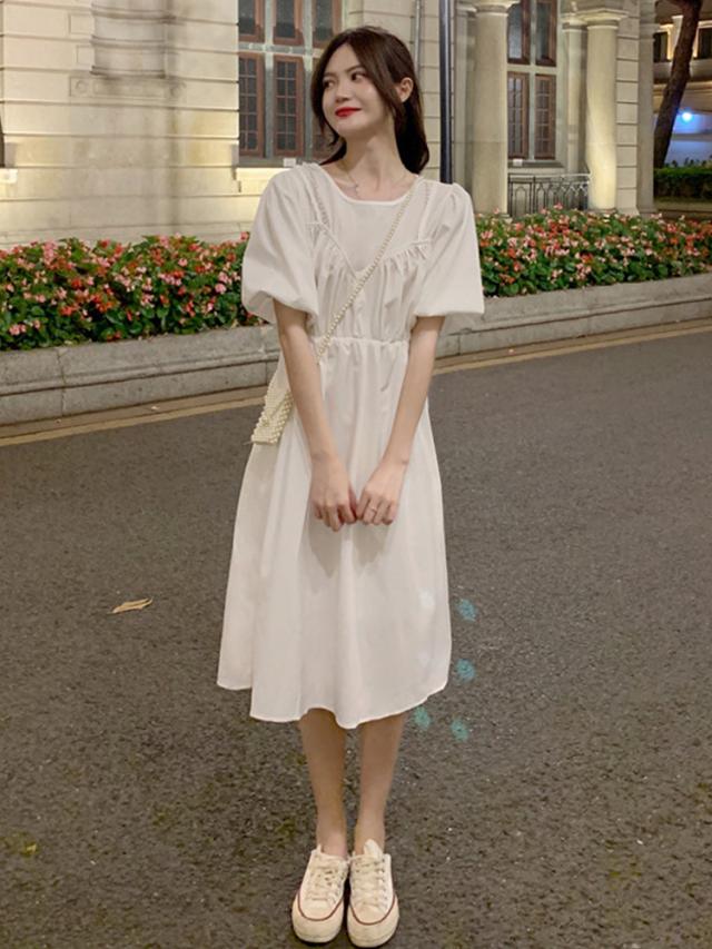 ワンピース レイヤード風 重ね着風 キャミソール バックリボン 半袖 袖あり ロング 膝下 ひざ下 ミディ丈 ラウンドネック 無地 シンプル パフスリーブ パフ袖 くしゅくしゅ ギャザー シャーリング ハイウエスト 切り替え 大人可愛い かわいい 可愛い 大人女子 おしゃれ お洒