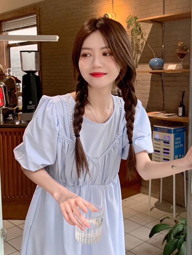 ワンピース レイヤード風 重ね着風 キャミソール バックリボン 半袖 袖あり ロング 膝下 ひざ下 ミディ丈 ラウンドネック 無地 シンプル パフスリーブ パフ袖 くしゅくしゅ ギャザー シャーリング ハイウエスト 切り替え 大人可愛い かわいい 可愛い 大人女子 おしゃれ お洒落 通勤 通学 学生 お出かけ デート 旅行 休日 普段着 普段使い レディース 10代 20代 夏 ワンサイズ ライトブルー 水色 ホワイト 白
