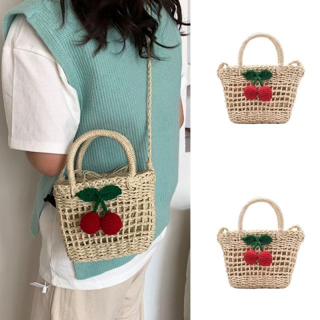 ニット編みチェリーがアクセントになったストロー素材のバケットバッグ♪
