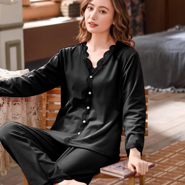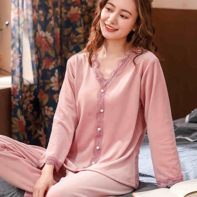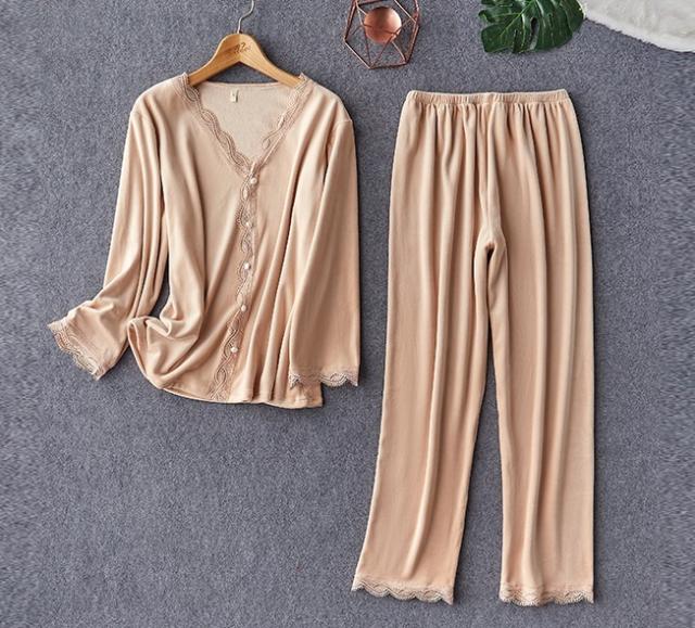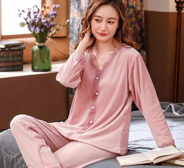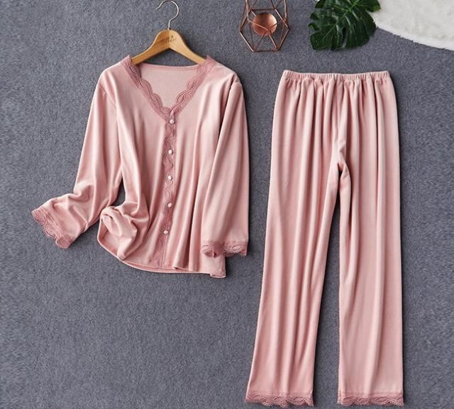 パジャマ ベルベット ベロア ルームウェア 2点セット 暖かい あったか トップス ボトムス 上下セット ツーピース パール Vネック レース フロントボタン 長袖 袖あり 襟なし パンツ ロング ズボン シンプル 無地 ウエストゴム 伸縮性 大人 おしゃれ お洒落 大人可愛い かわいい 可愛い お泊り デート 旅行 休日 部屋着 寝巻き 10代 20代 レディース 春 秋 冬 M L XL 2XL ピンク アプリコット ホワイト 白 ブラック 黒