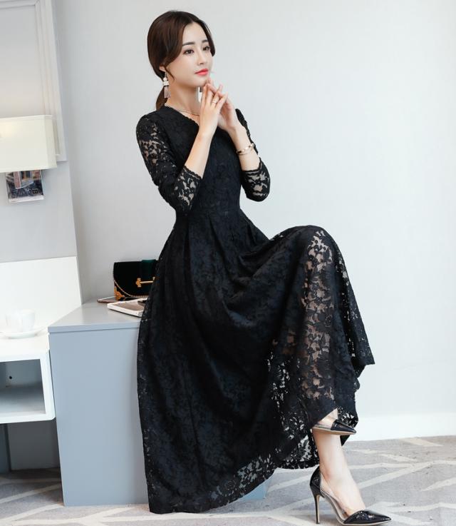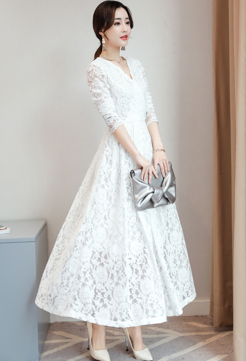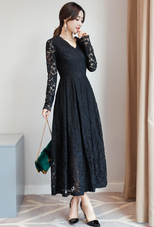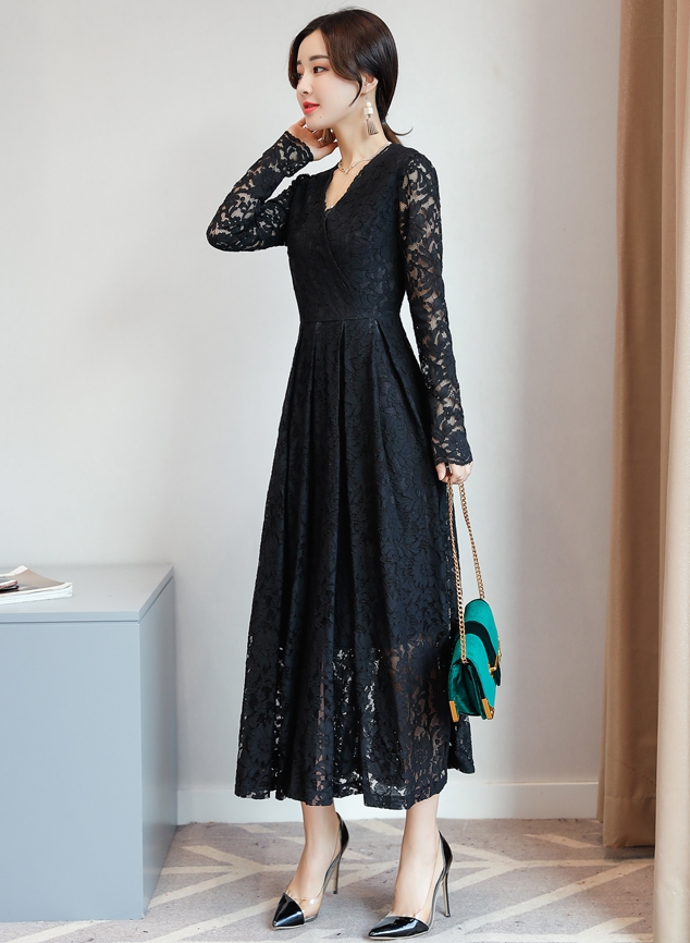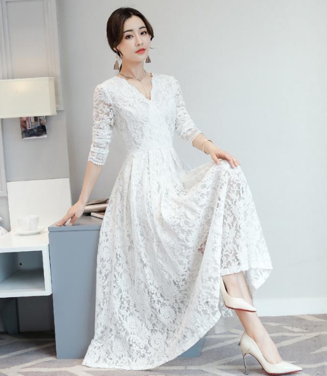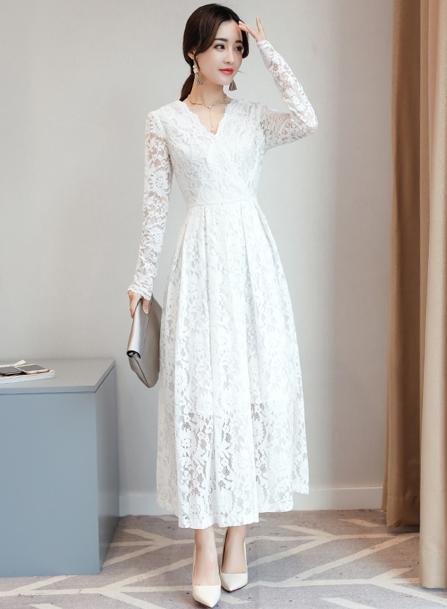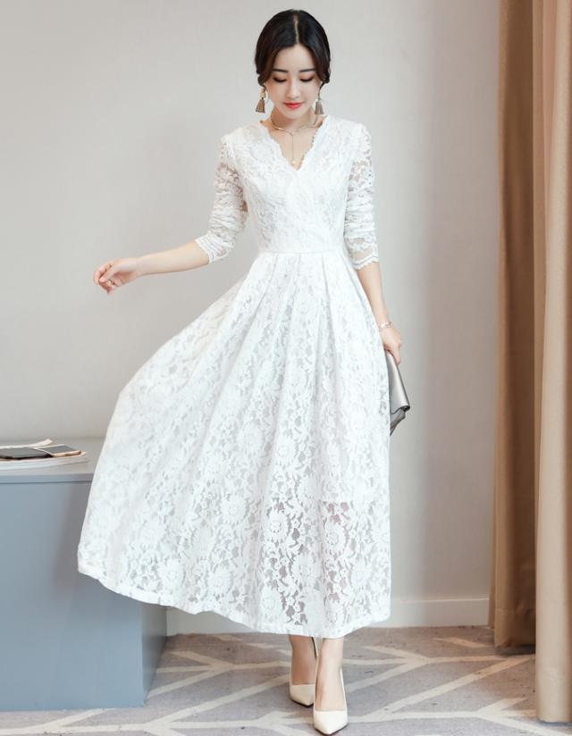 Vネック レース ワンピース 白 黒 レディース 結婚式 パーティー ドレス ロング丈 長袖 フレア Aライン レース ウエストマーク スタイルアップ 大人 可愛い きれいめ フェミニン シンプル 大人 おしゃれ ラブリー キュート ガーリー 花柄 お出かけ デート お呼ばれ 韓国