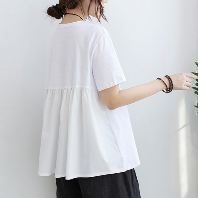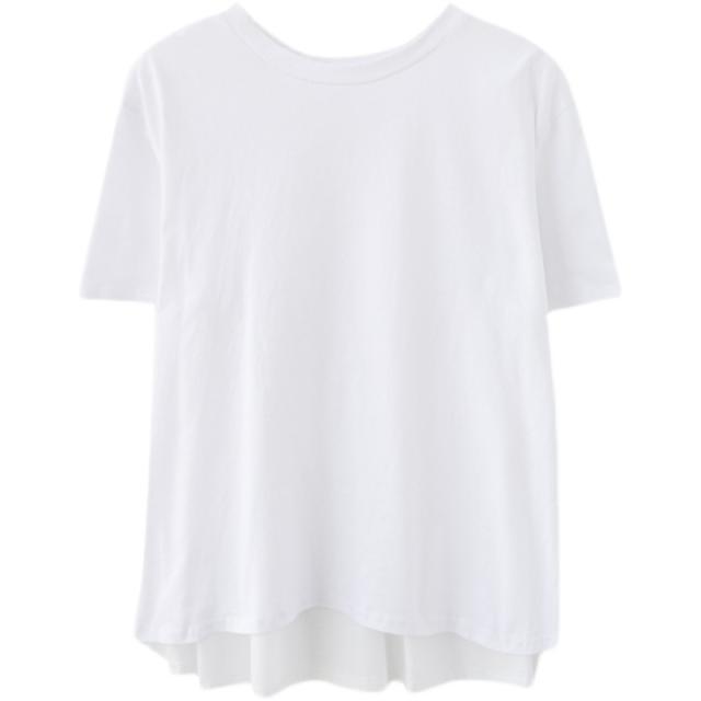 Tシャツ レディース ゆったり 白 黒 半袖 綿 シンプル 無地 ラウンドネック ショート丈 イレギュラー アシンメトリー 背面デザイン 切り替え 異素材 ギャザー 着回し リラックス 大きめ ボリューム ルーズ 体型カバー おしゃれ 通勤 通学 お出かけ デート 旅行 休日 普段着