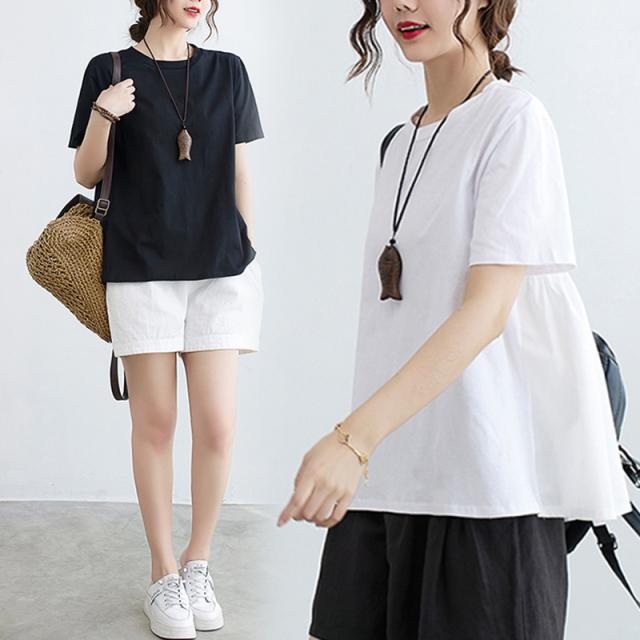 Tシャツ 半袖 袖あり コットン 綿 シンプル 無地 ラウンドネック 短丈 ショート丈 ショート イレギュラー アシメ アシンメトリー 背面デザイン 切り替え ギャザー ゆったり ゆる 大きめ ルーズ 体型カバー おしゃれ お洒落 通勤 通学 お出かけ デート 旅行 休日 普段着 普段使い 着回し 部屋着 スポーツ 運動 レディース 夏 大きいサイズ L XL 2XL ホワイト 白 ブラック 黒