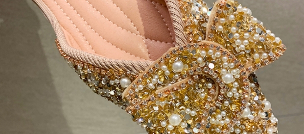 ラインストーンやパールがふんだんに散りばめられたローヒールパンプス♪