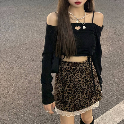 2点セット ロングTシャツ ミニスカート 上下セット ツーピース トップス ボトムス ロンT 長袖 袖あり ショート丈 ハート カットアウト オフショル オフショルダー ミニ丈 スカート ハイウエスト 花柄 レース Aライン 台形シルエット セットアップ 大人可愛い かわいい 可愛い 女の子 おしゃれ お洒落 通勤 通学 学生 お出かけ デート 旅行 休日 普段着 普段使い 着回し 10代 20代 レディース 春 夏 秋 S M ブラック 黒 レオパード