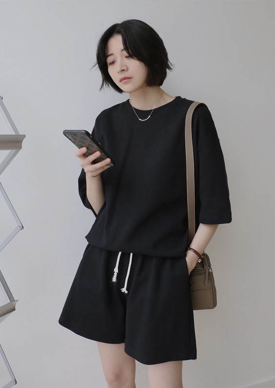 セットアップ レディース ラウンドネック 5分袖 ロールアップ ショートパンツ ウエストゴム シャツイン ワイドレッグ 細見え シンプル 無地 ラフ 楽ちん 涼しい ストリート カジュアル ルーズ ゆったり リラックス 大人 可愛い 韓国 着回し 普段着 お出かけ おうち時間