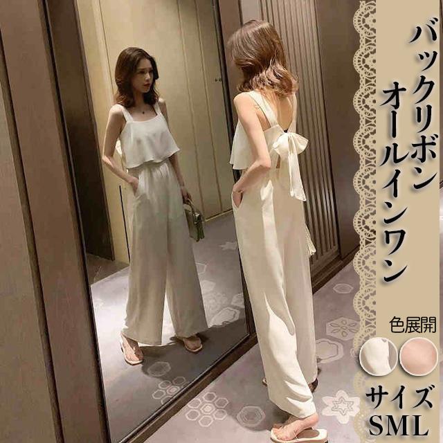バックリボン オールインワン キャミソール パンツ ジャンプスーツ ワイドレッグパンツ 袖なし スクエア 背中魅せ 背中開き バックシャン シフォン ゆったり 無地 シンプル ハイウエスト 切り替え 楽ちん ラフ おしゃれ お洒落 こなれ感 大人女子 大人可愛い かわいい 可愛い 通勤 通学 学生 お出かけ デート 旅行 休日 普段着 普段使い カジュアル 10代 20代 レディース 夏 S M L クリーミーホワイト ピンク