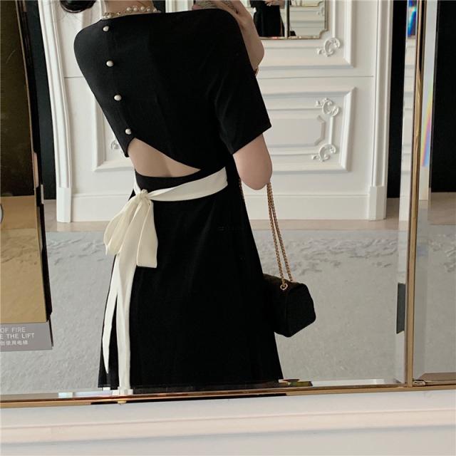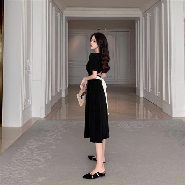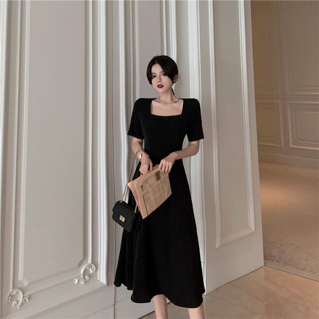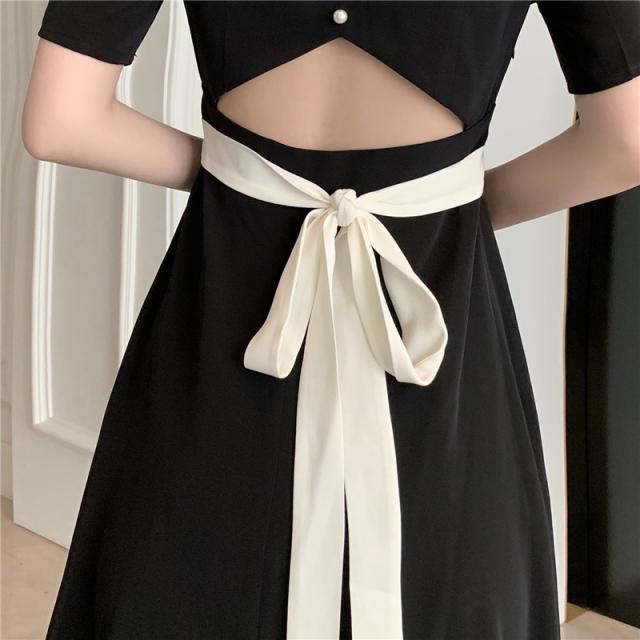 ワンピース レディース 黒 きれいめ フォーマル Aライン エレガント 韓国 フレア かわいい 着?せ セレモニー 膝下 ミモレ丈 半袖 スクエアネック 切り替え デザイン ウエストマーク リボン バックシャン パール 大人 シンプル カジュアル 大人 上品 おしゃれ お洒落 無地