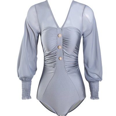 水着 ワンピース レディース パッド付き 体系カバー 二の腕カバー ボリューム袖 長袖 切り替えデザイン バックシャン 透け感 シースルー バックオープン ボタン 大人 可愛い きれいめ シンプル 華やか 大人っぽい お洒落 美脚 韓国 オルチャン 青 夏 海 プール リゾート