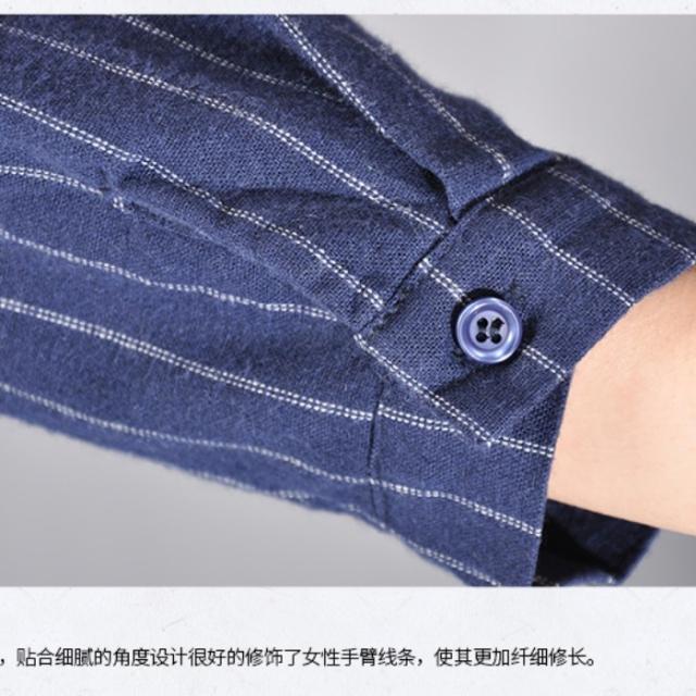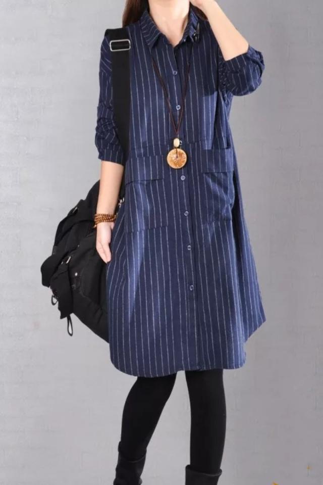 ストライプ シャツ ワンピース レディース 膝丈 膝上 袖あり 7分袖 襟付き Iライン 前開き 前ボタン ポケット付き 綿 大人 可愛い きれいめ ゆったり シンプル お洒落 韓国 オルチャン 青 春 夏 秋 学生 OL 通学 重ね着 お出かけ 休日 デート 着回し 普段使い