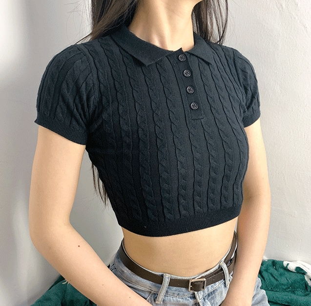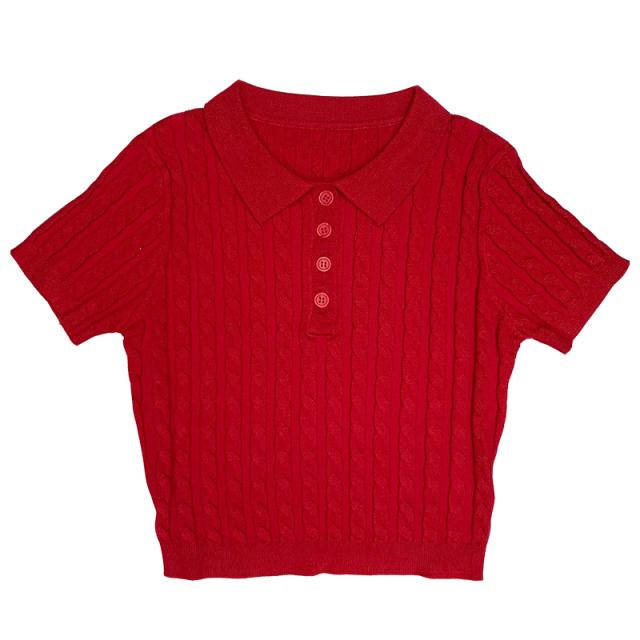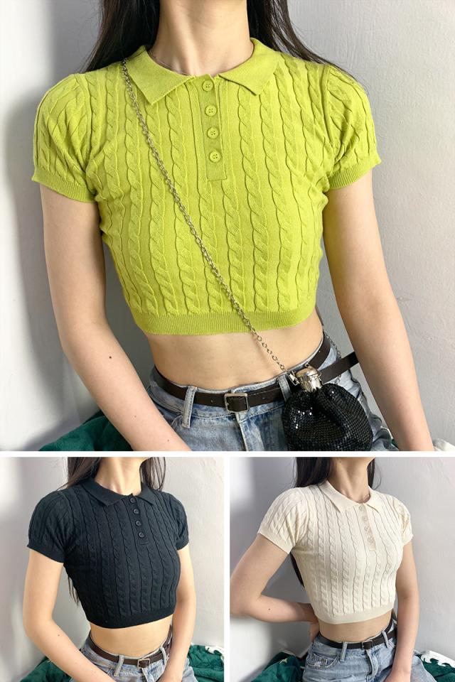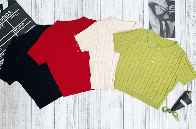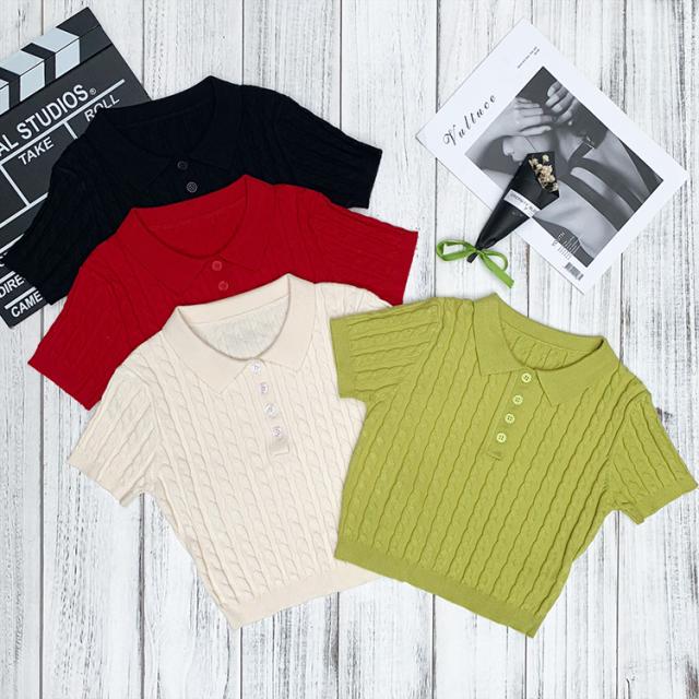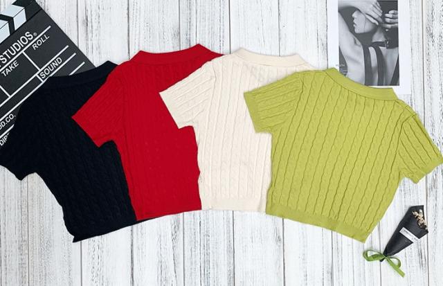 ニット ポロシャツ レディース トップス シャツ ショート丈 短い 袖 襟付き スリム タイト 細身 大人 可愛い きれいめ シンプル カジュアル お洒落 韓国 オルチャン 編み柄 黒 緑 赤 大きいサイズ 3XL 4XL 5XL 6XL 春 夏 学生 通学 デート お出かけ 女子会 着回し