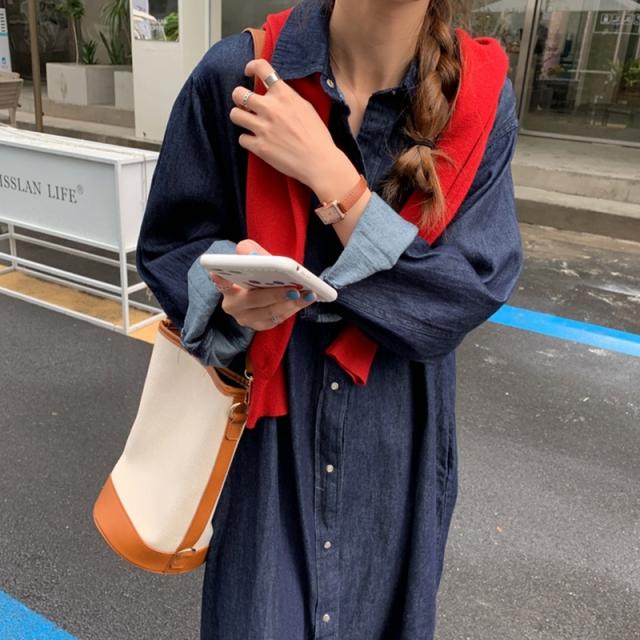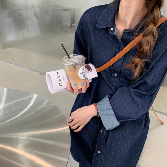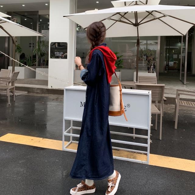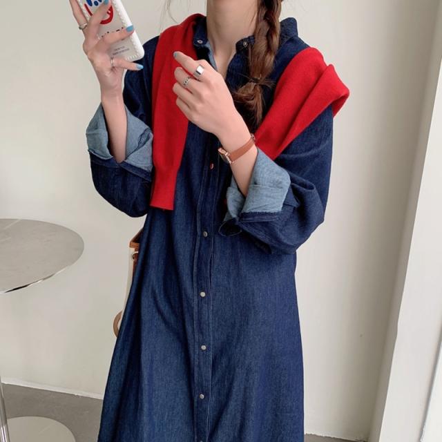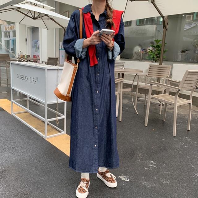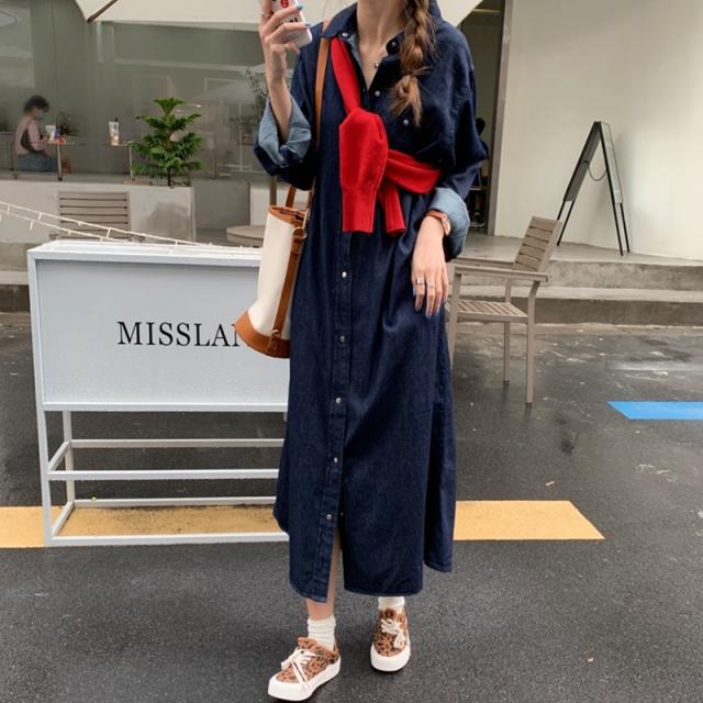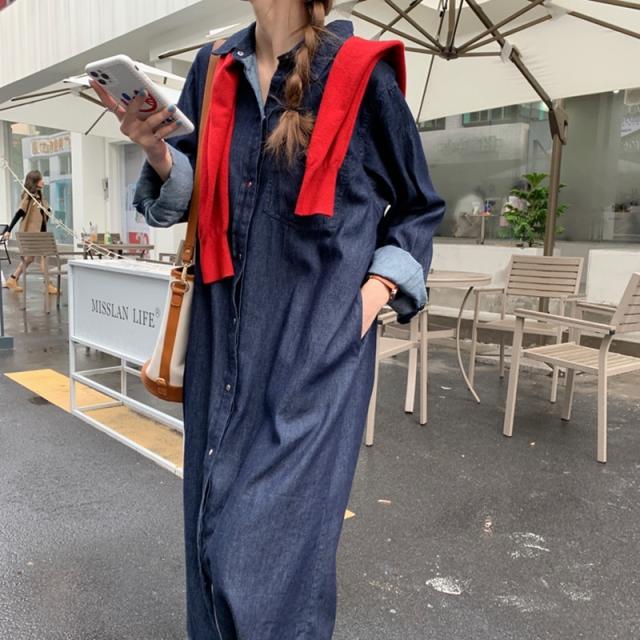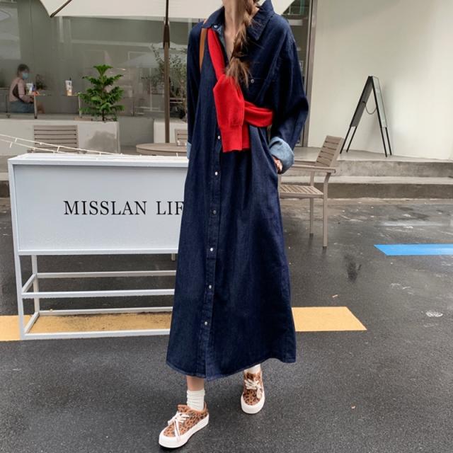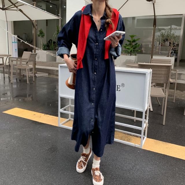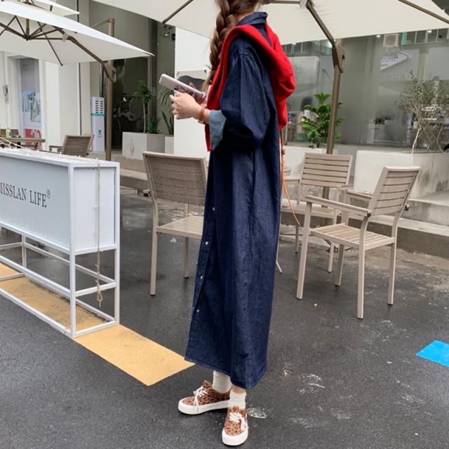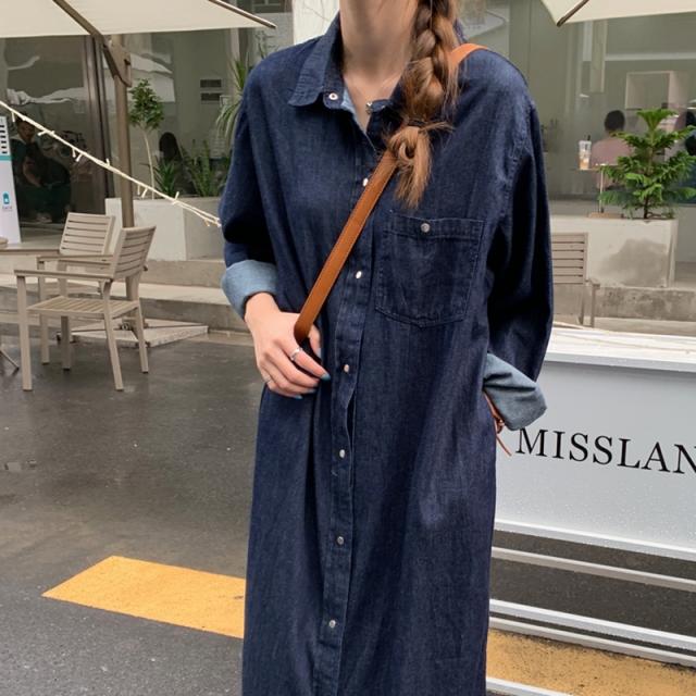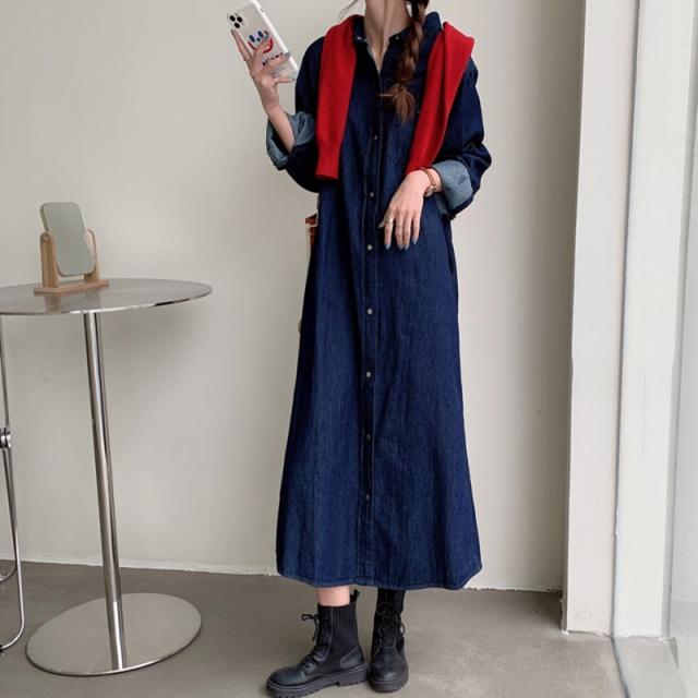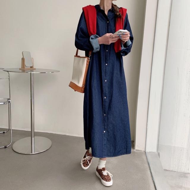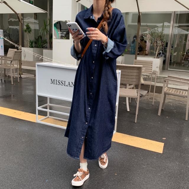 デニム ロング シャツ ワンピース レディース ロング丈 袖あり 長袖 ラグラン 襟付き Iライン 前開き ゆったり かわいい 大人 可愛い きれいめ シンプル カジュアル お洒落 韓国 オルチャン ネイビー 春 夏 秋 学生 通学 デート 休日 重ね着 着回し 普段着