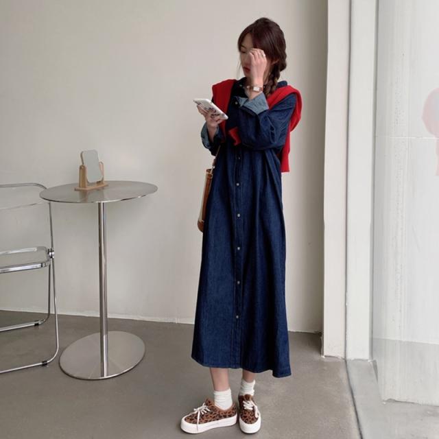 デニムロングシャツワンピース ワンピース シャツワンピース ロング ロング丈 袖あり 長袖 襟付き Iライン 前開き デニム かわいい 大人可愛い きれいめ シンプル カジュアル おしゃれ お洒落 大人可愛い 大人女子 無地 ボタニカル 春 夏 秋 10代 20代 30代 レディース 学生 通学 デート お出かけ 女子会 休日 着回し 普段使い 重ね着 韓国 韓国系 オルチャン 色展開 ネイビー