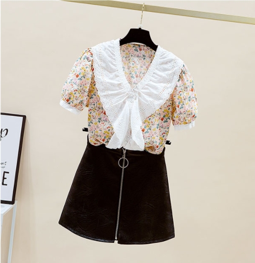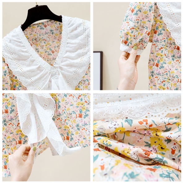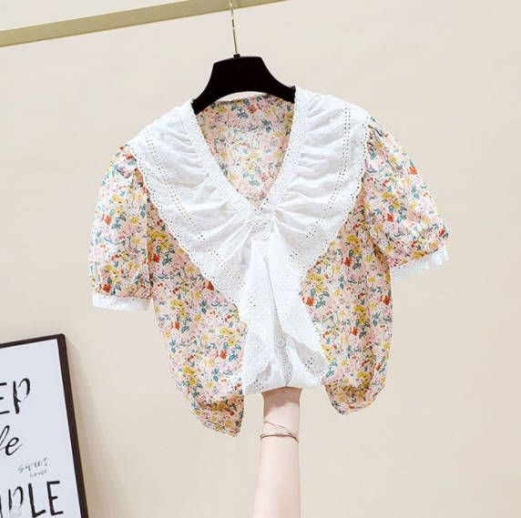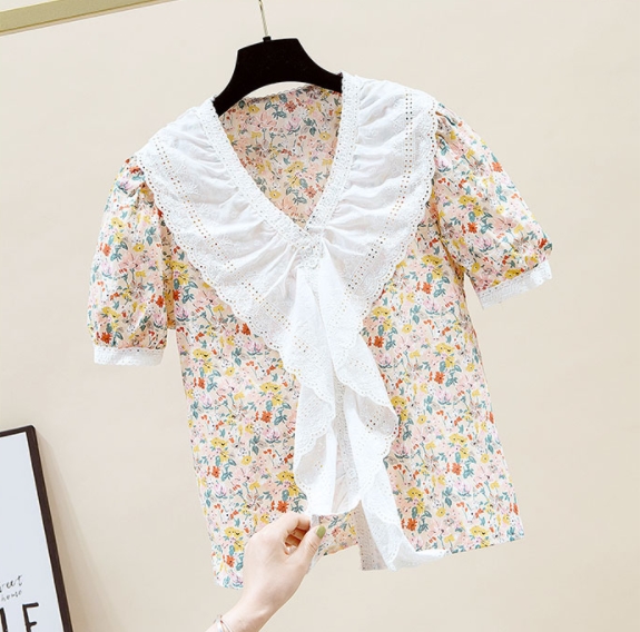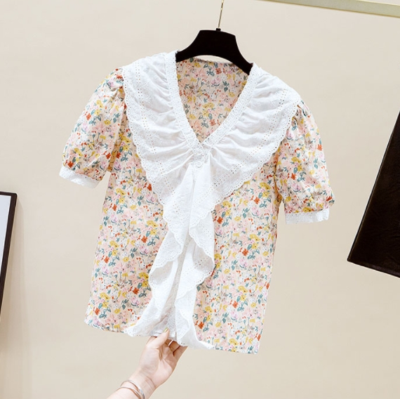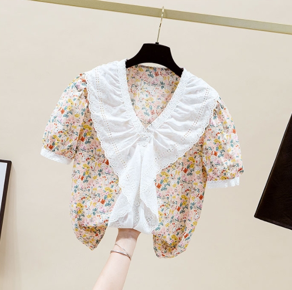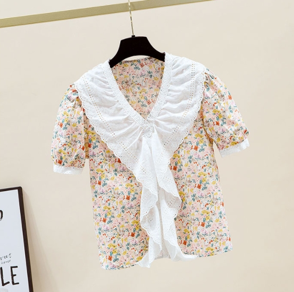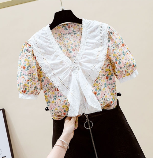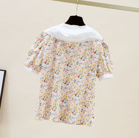 大きなレースの襟と花柄が良く合う半袖トップス♪