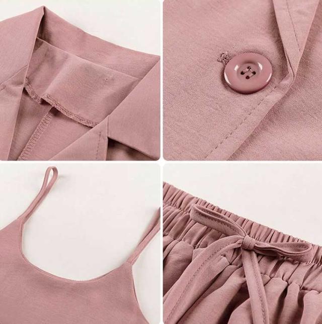 サマー セットアップ 3点セット ジャケット キャミソール パンツ スリーピース 上下セット 無地 シンプル 襟付き スーツ襟 七分袖 7分袖 袖あり フロントボタン ウエストゴム トップス ボトムス ショートパンツ ワイド ゆったり ルーズ ゆる カジュアル こなれ感 おしゃれ お洒落 大人可愛い かわいい 可愛い 韓国 オルチャン 大人女子 通勤 通学 学生 お出かけ デート 旅行 休日 普段使い 着回し レディース 夏 10代 20代 S M L XL ブラック 黒 ブルー 青 ダスキーピンク
