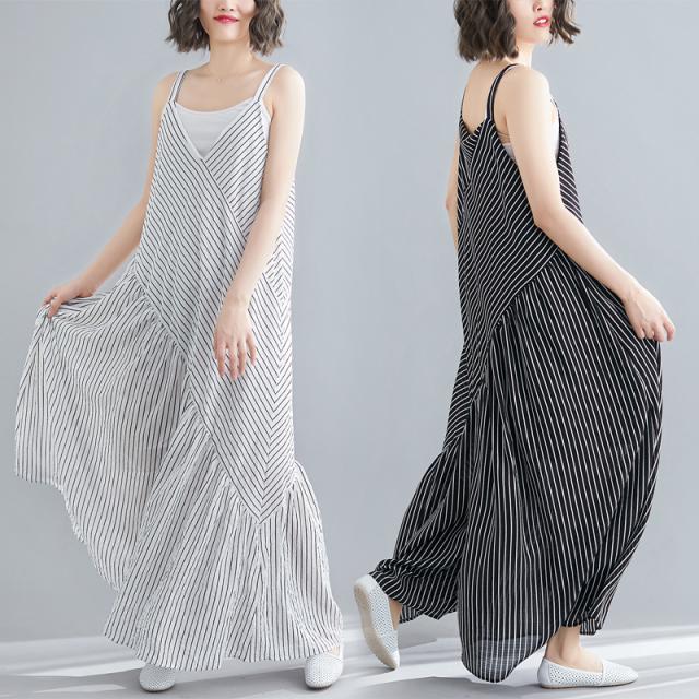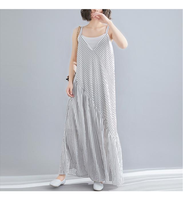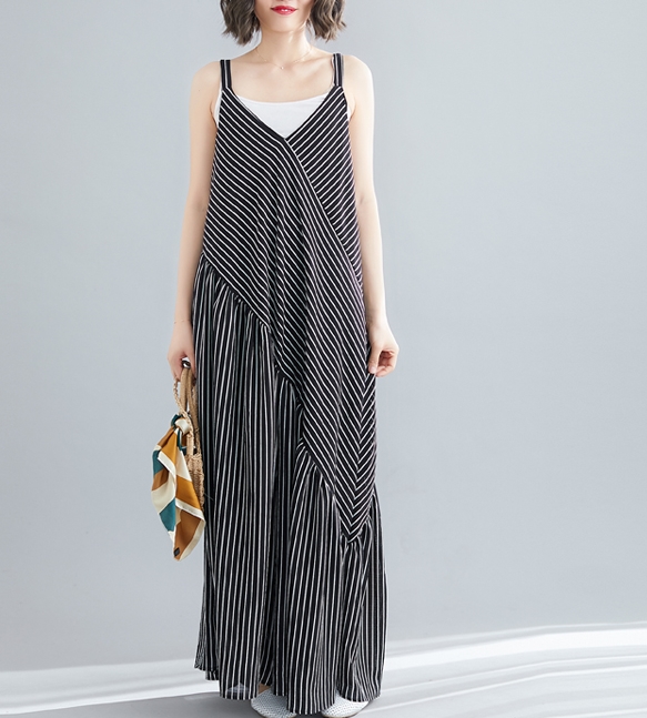 Vネック キャミ ワンピース レディース フレア ロング ロング丈 マキシ マキシ丈 袖なし 背中魅せ 切り替え ゆったり Aライン ポリエステル 大人 可愛い きれいめ シンプル カジュアル お洒落 こなれ感 ストライプ 韓国 オルチャン 黒 白 春 夏 休日 デート リゾート 海