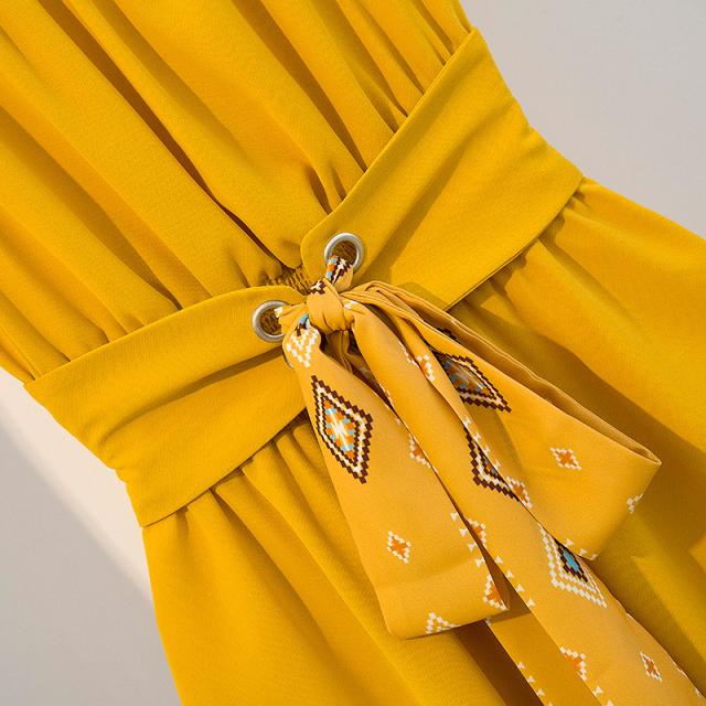 ワンピース オフショルダー レディース フレアスリーブ フレア袖 半袖 ウエスタン 柄 シンプル リボン ウエストマーク ベルト ウエスト絞り シャーリング ギャザー 伸縮性 ポケット付き ロング 大きいサイズ 2XL 3XL 4XL 大人 可愛い 黄色 夏 デート お出かけ 休日