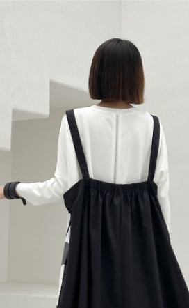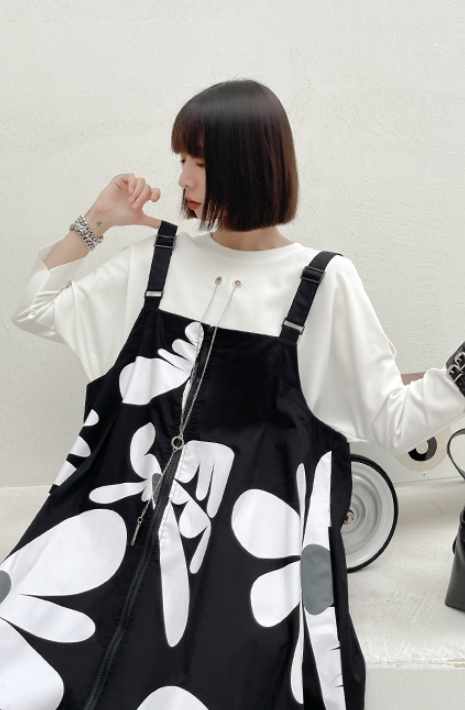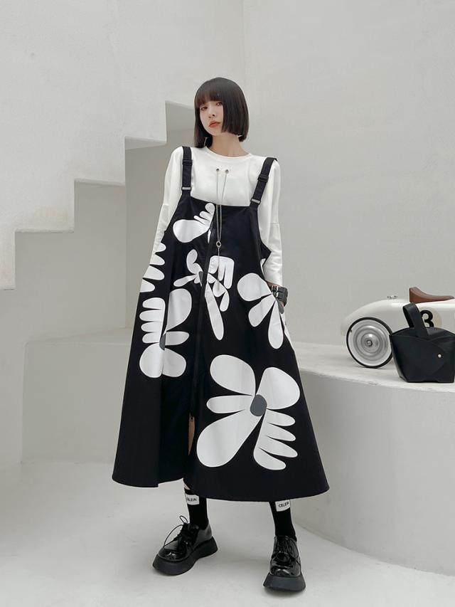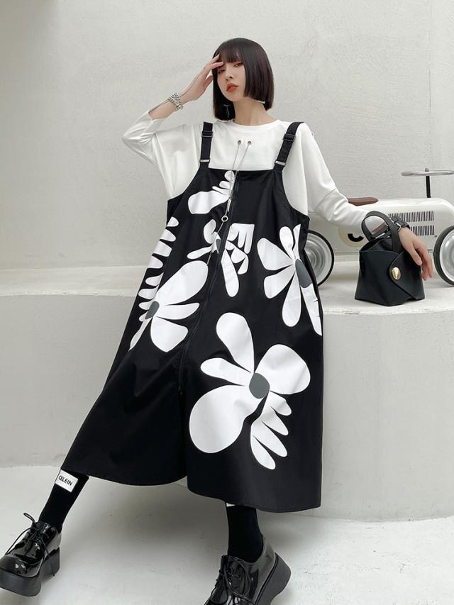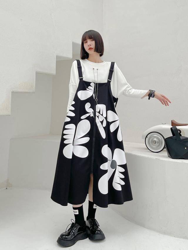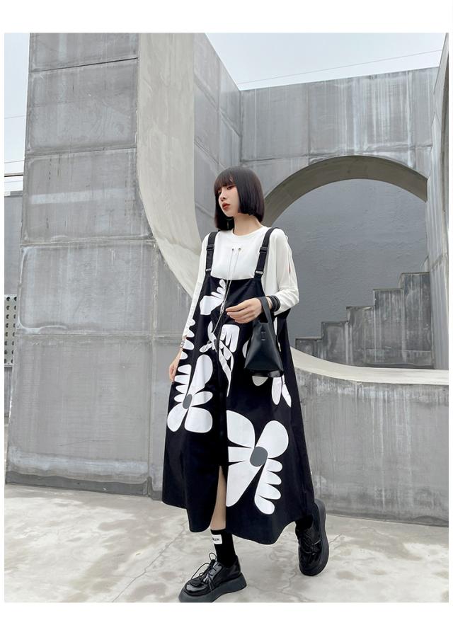 ストラップスカート ワンピース レディース カジュアル サスペンダー ドレス ミドル丈 ノースリーブ ワイド Aライン スリット ファスナー ポケット 前開き ストラップ おしゃれ レトロ ルーズ ゆったり 大きい サイズ 着回し イラスト 個性的 オールシーズン