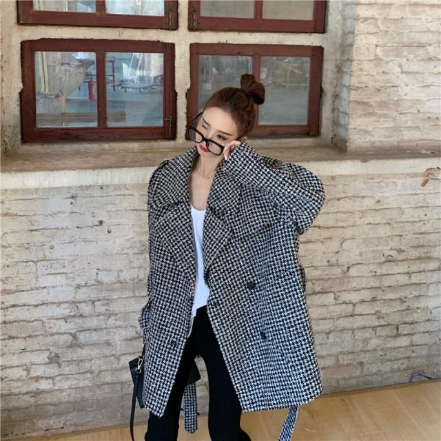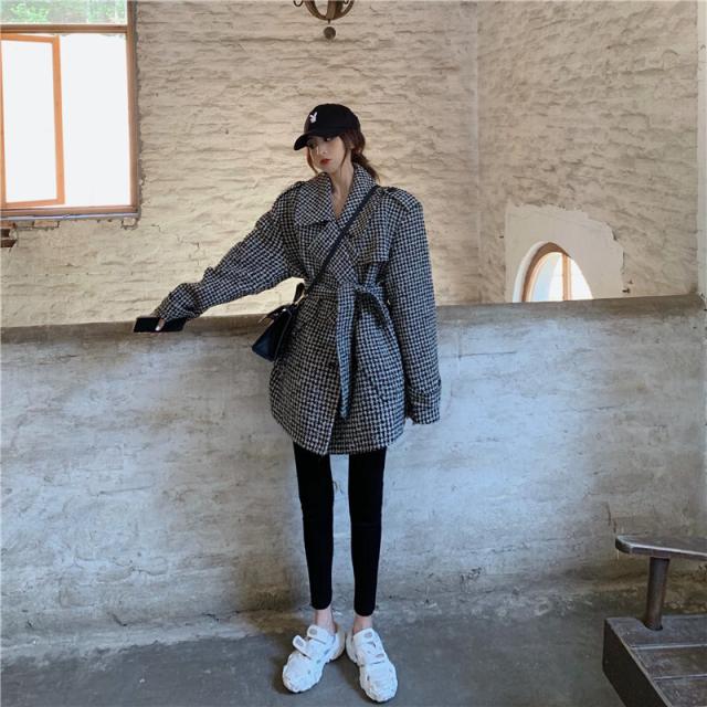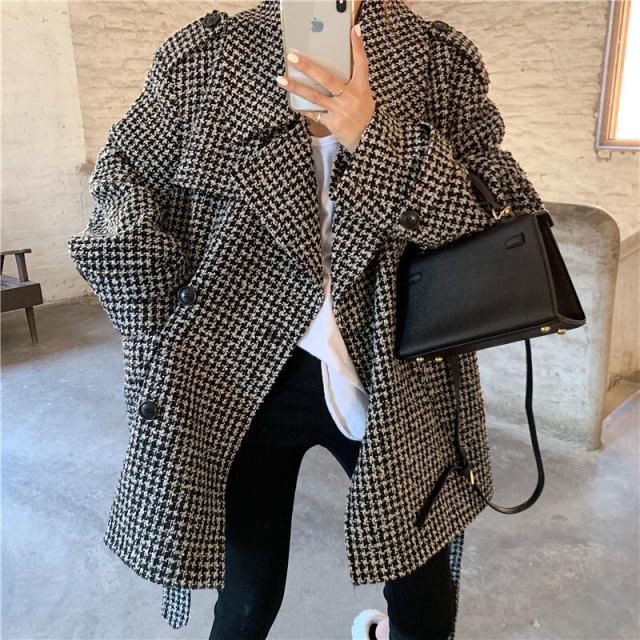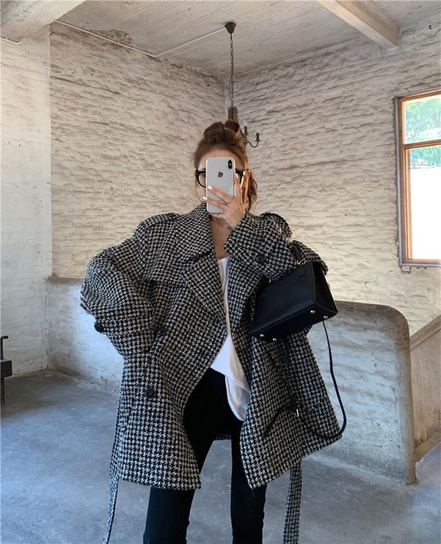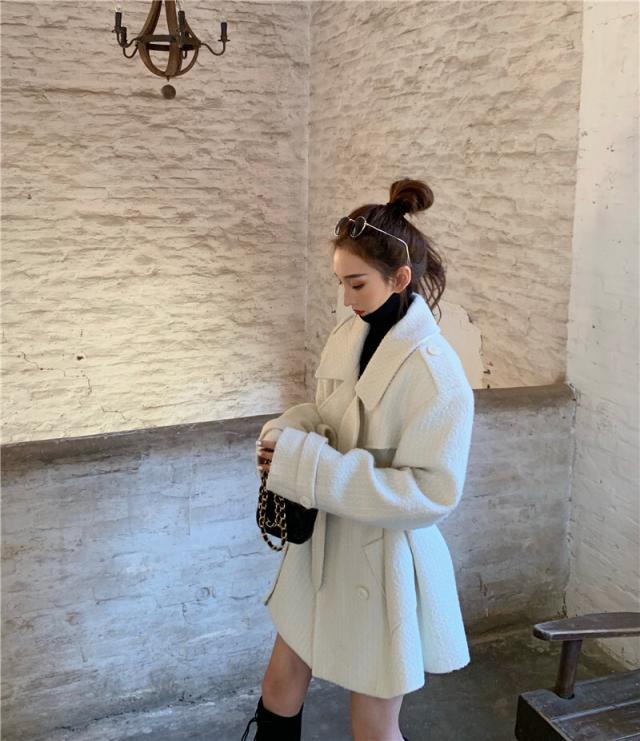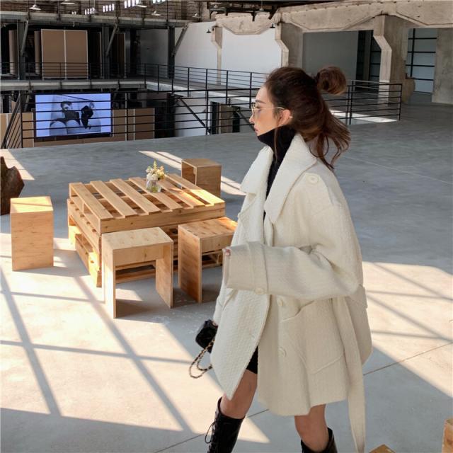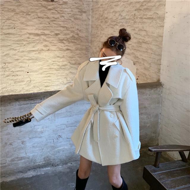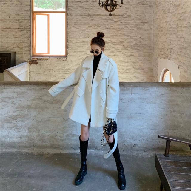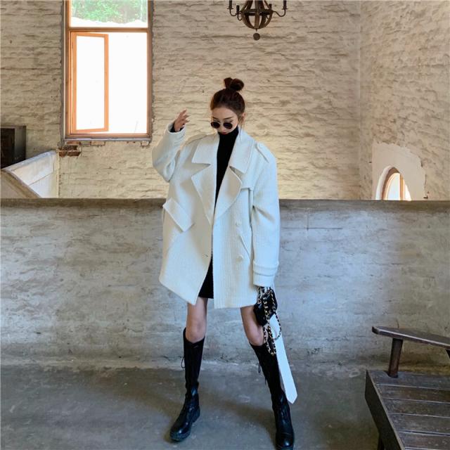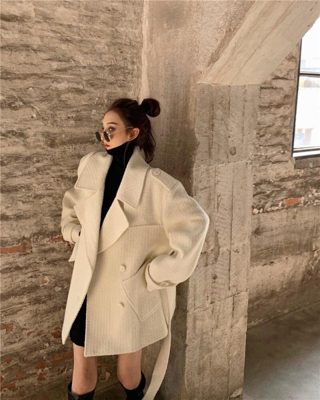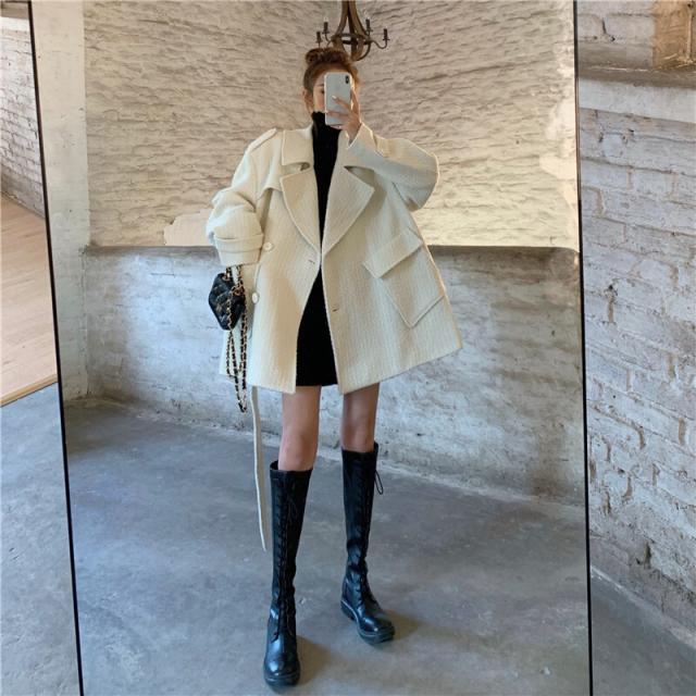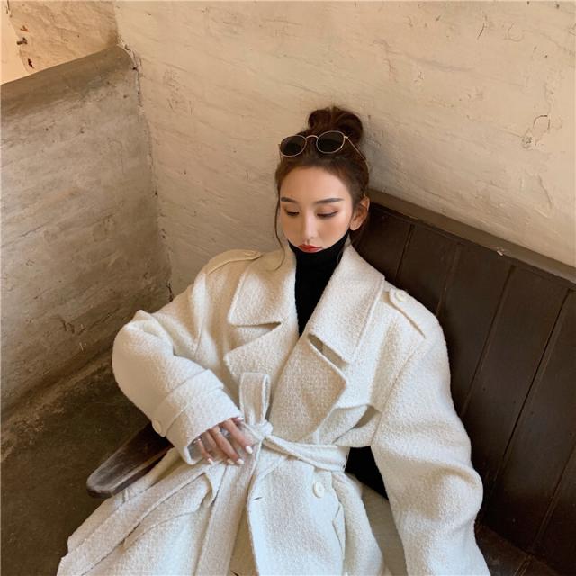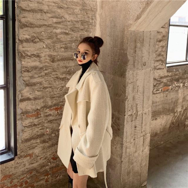 オーバーサイズ コート レディース アウター ミディアム丈 お尻 隠れる 長袖 萌袖 Vネック 襟付き 襟 大きめ ベルト ウエストマーク 前開き ウール きれいめ シンプル カジュアル お洒落 かっこいい 大人 可愛い 女子 こなれ感 オフホワイト ブラック 学生 通学 デート