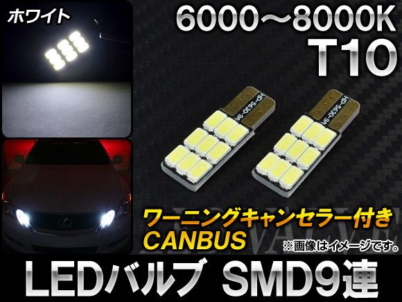 LEDバルブ ホワイト 6000〜8000K CANBUS ワーニングキャンセラー付き T10 入数:2個 AP-CBUS-T10W9-WH LED バルブ LEDライト ライト LEDランプ ランプ ポジションランプ ライセンスランプ ルームランプ マップランプ ドアカーテシランプ ラゲッジ ラゲージ バニティ メーターランプ バックランプ BMW アウディ AUDI フォルクスワーゲン VOLKSWAGEN ポロ POLO メルセデス ベンツ BENZ ポルシェ ランドローバー ミニクーパー ミニ MINI SMD 9連 9発 9個 9灯 12V 白 WHITE ウェッジ球 ウエッジ球 電球 電灯 照明 CAN-BUS 輸入車 外国車 欧州車 ヨーロッパ車 アメリカ車 アメ車 キャンセラー ワーニングキャンセラー 警告灯 カー 車 自動車 車両 カンバス キャンバス 4562430396260 457345780