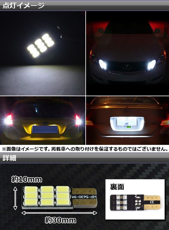 LEDバルブ ホワイト 6000〜8000K CANBUS ワーニングキャンセラー付き T10 入数:2個 AP-CBUS-T10W9-WH