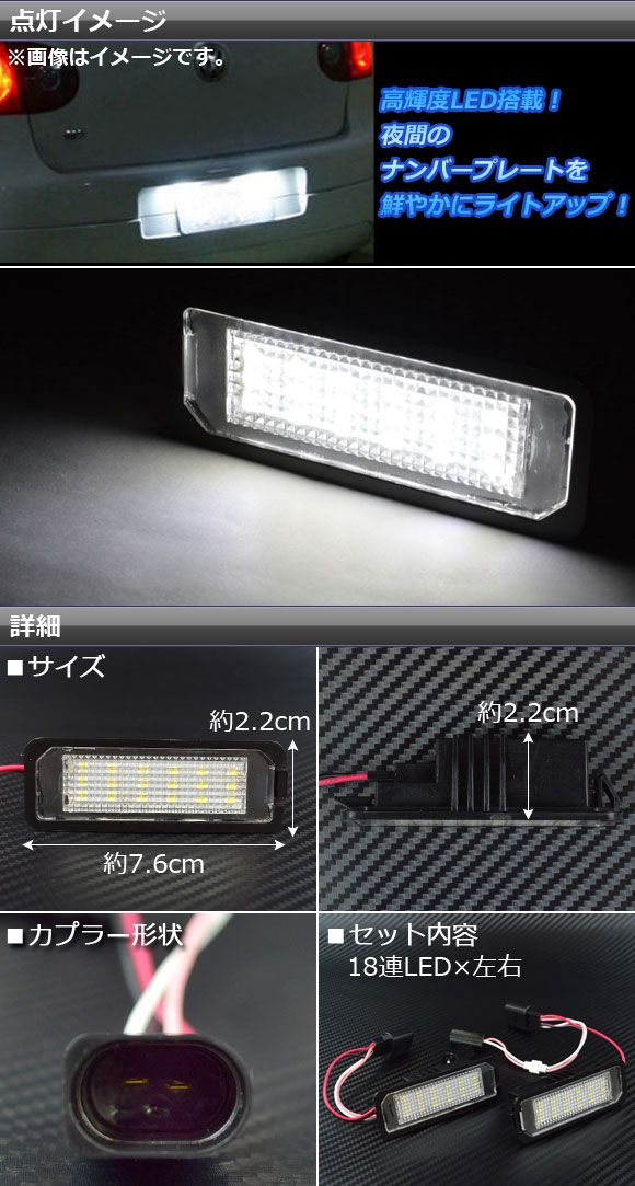 LEDライセンスランプ フォルクスワーゲン ゴルフGTI AUCHH 2013年〜 ホワイト キャンセラー内蔵 18連 AP-LC-VW-PO 入数:1セット(2個)