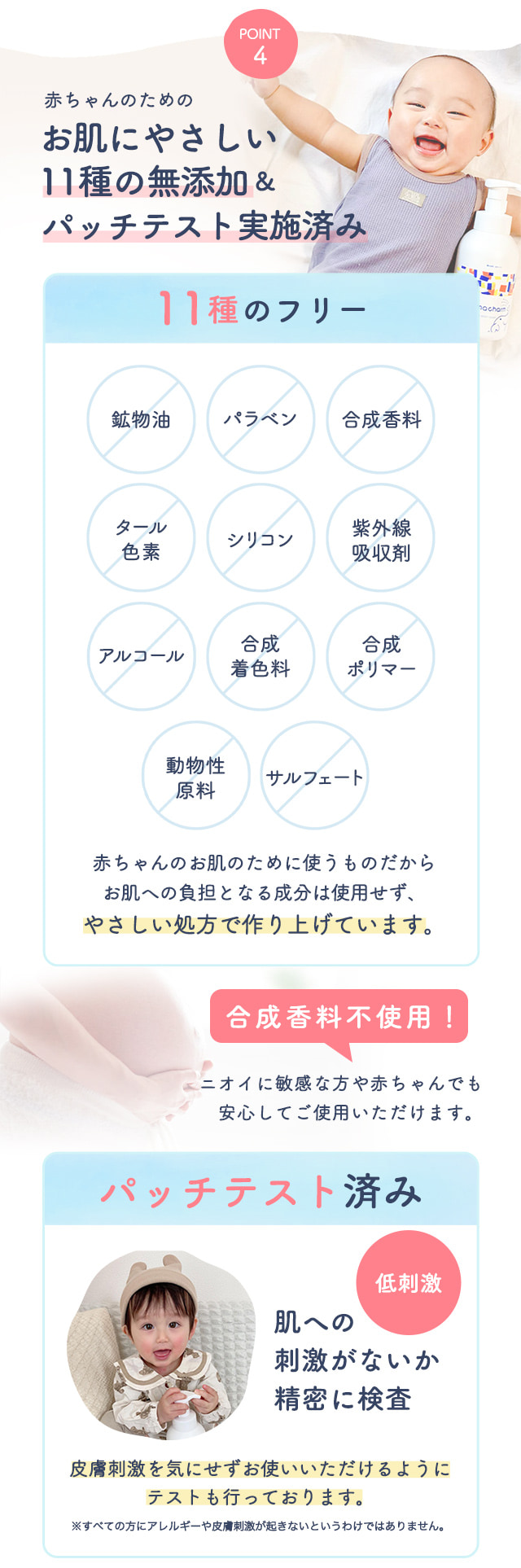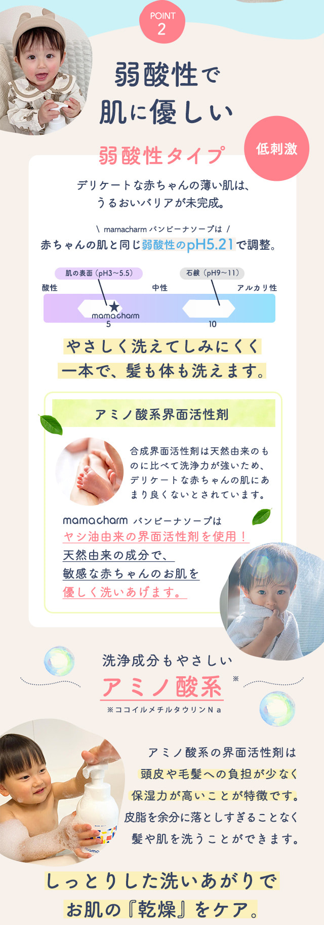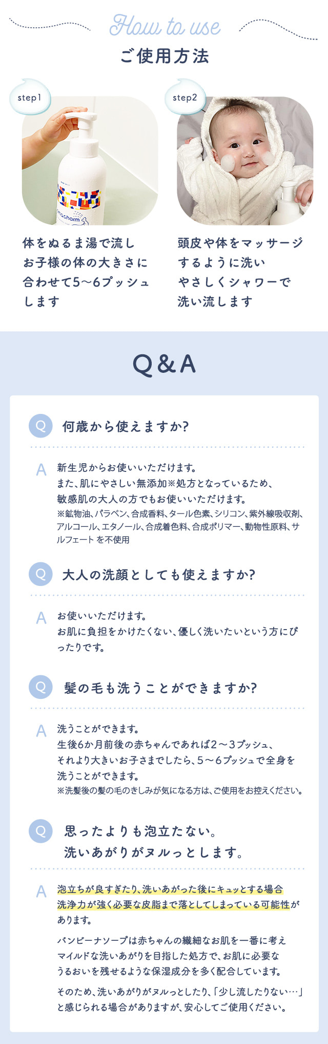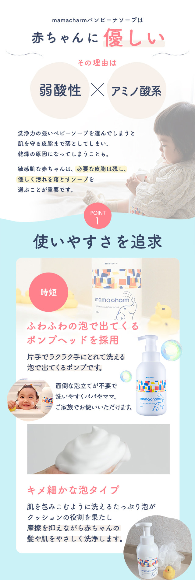 | 商品特徴 | デリケートな赤ちゃんの全身をやさしく洗う泡ソープ。 1本でデリケートな肌も髪も洗える♪ |