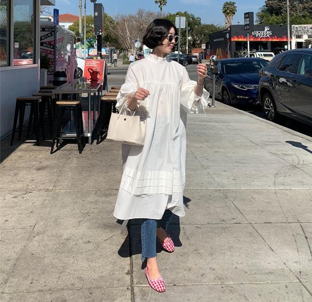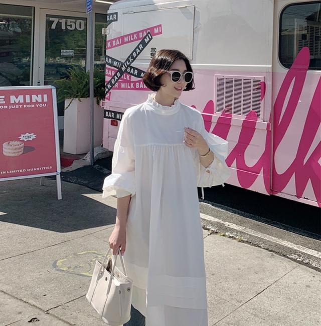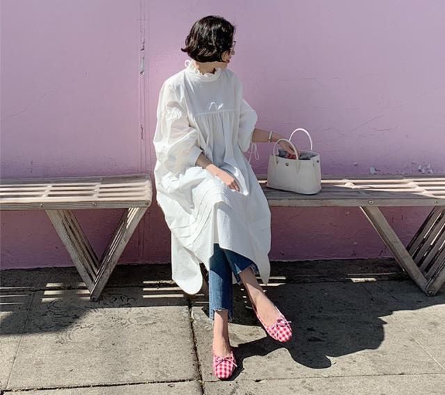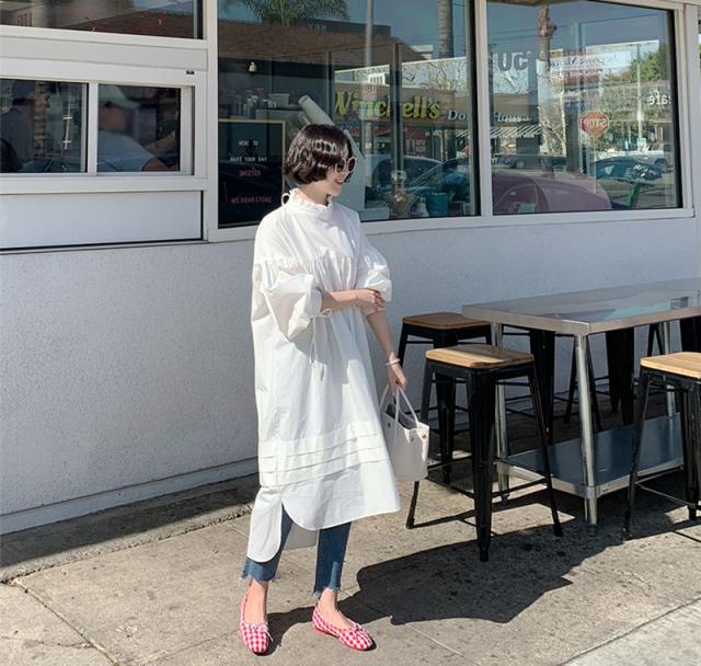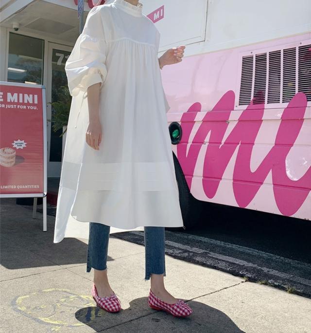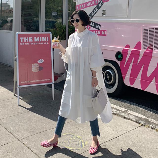 トップス シャツワンピース シャツ 白シャツ ワンピース 膝下 ミモレ ミモレ丈 袖あり 7分袖 七分袖 パフスリーブ 襟付き スタンドカラー フリル バックリボン ポケット 大人可愛い きれいめ シンプル カジュアル 大人 おしゃれ お洒落 大人女子 ルーズ 無地 春 夏 秋 30代 40代 50代 レディース ママ マタニティ 通勤 デート お出かけ 公園デビュー 女子会 休日 旅行 着回し 普段使い 重ね着 楽ちん 体系カバー ゆったり ゆる S M L XL 色展開 白 ホワイト 黒 ブラック