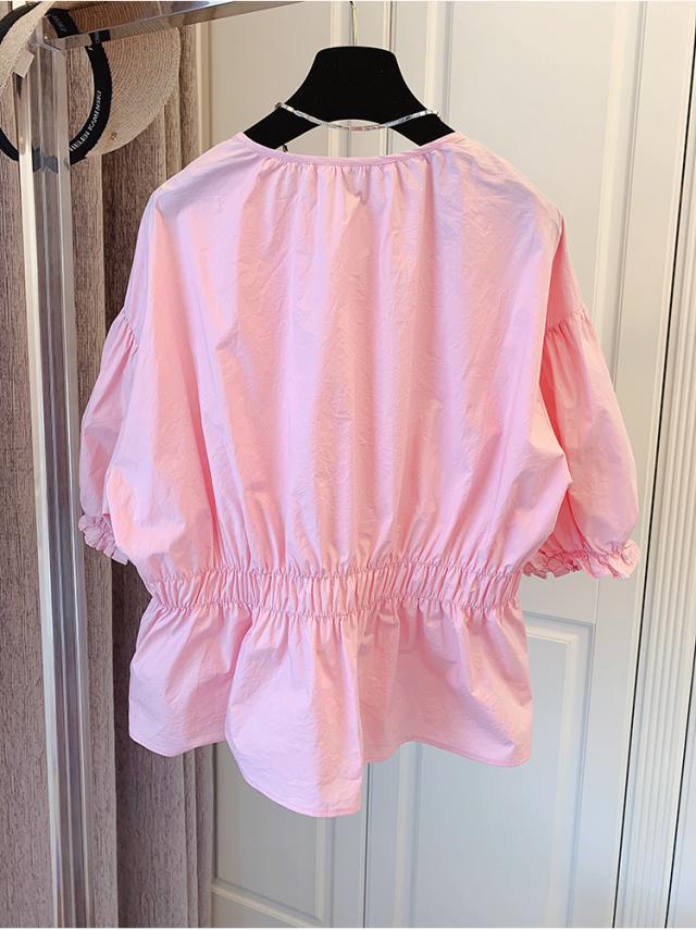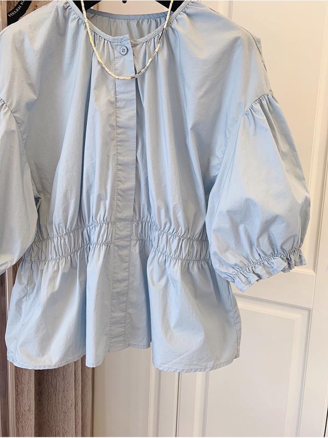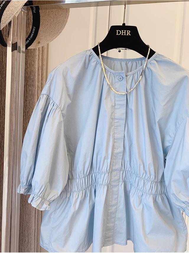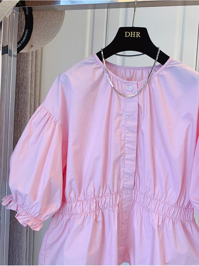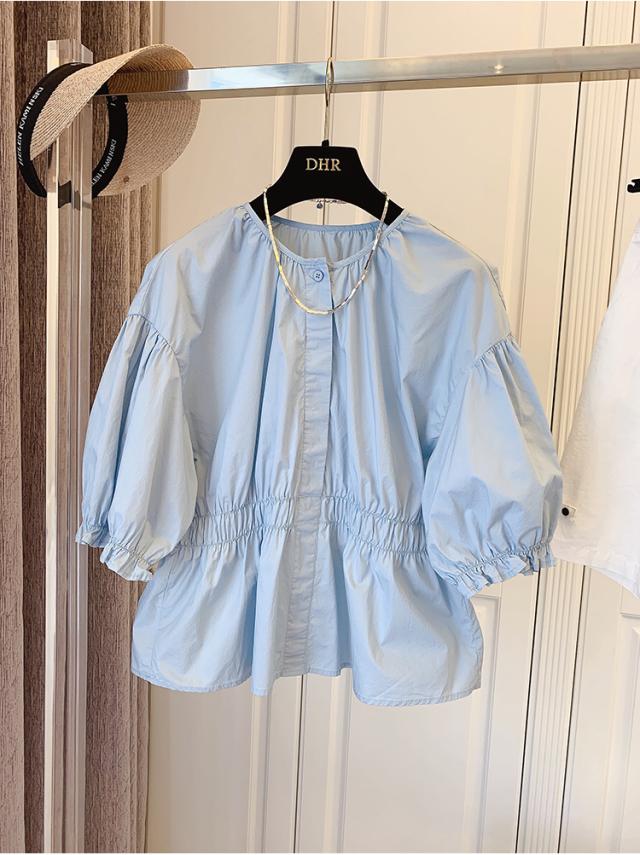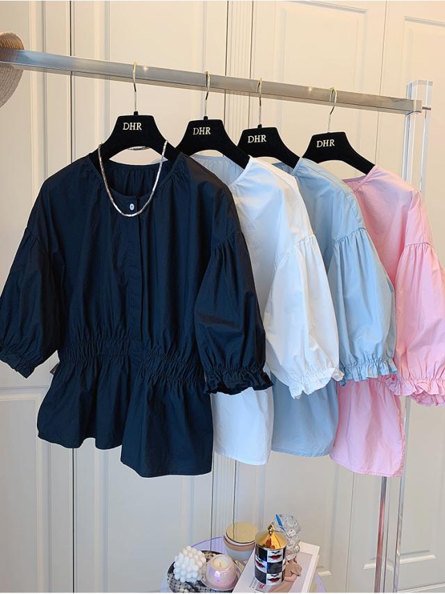トップス 半袖 シャツ ブラウス 白シャツ ショート ショート丈 袖あり パフスリーブ ドロップショルダー ラウンドネック 襟なし ペプラム 切り替えデザイン フリル 大人可愛い シンプル カジュアル 大人 おしゃれ お洒落 大人女子 キュート ガーリー ルーズ 無地 春 夏 秋 30代 40代 50代 レディース ママ 通勤 デート お出かけ 公園デビュー 女子会 休日 旅行 着回し 普段使い 重ね着 韓国 体系カバー ゆったり フリーサイズ 色展開 白 ホワイト 黒 ブラック 青 ブルー ピンク