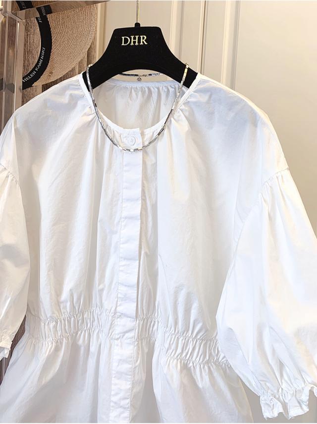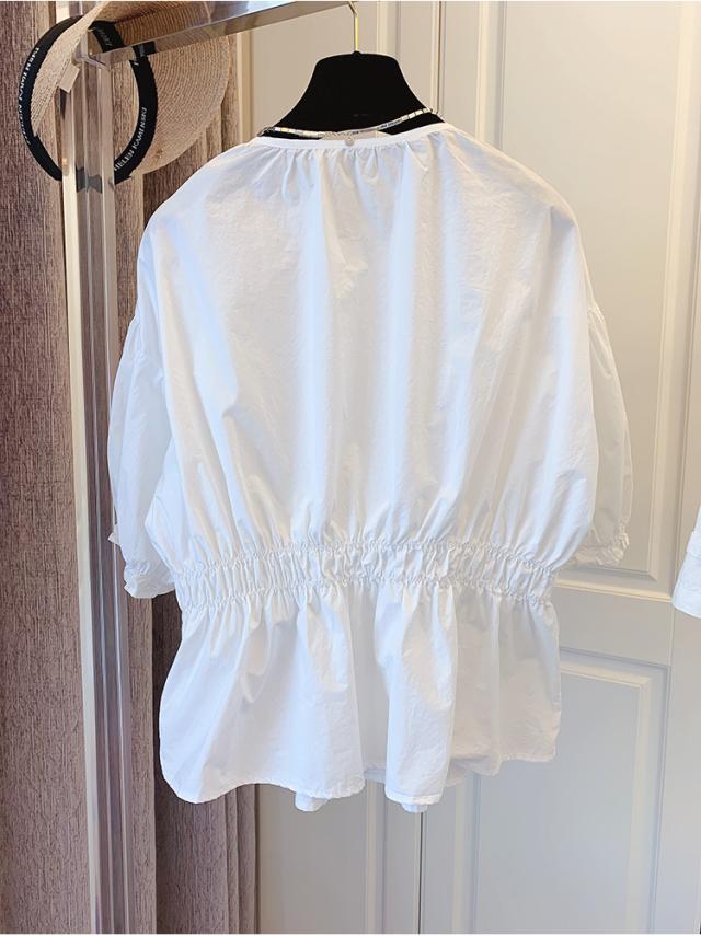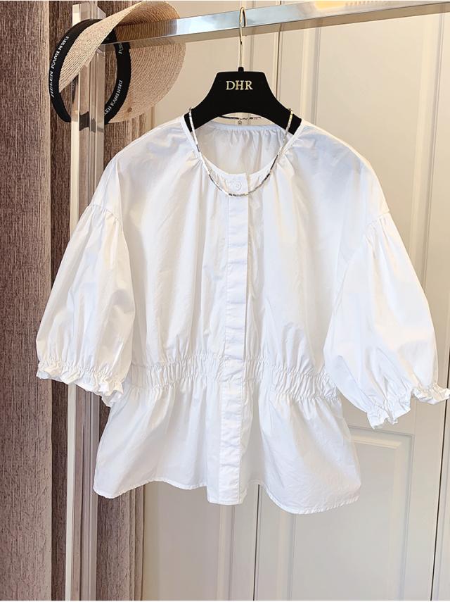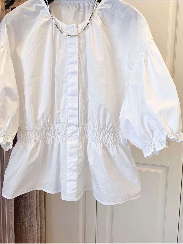トップス 半袖 シャツ ブラウス 白シャツ ショート ショート丈 袖あり パフスリーブ ドロップショルダー ラウンドネック 襟なし ペプラム 切り替えデザイン フリル 大人可愛い シンプル カジュアル 大人 おしゃれ お洒落 大人女子 キュート ガーリー ルーズ 無地 春 夏 秋 30