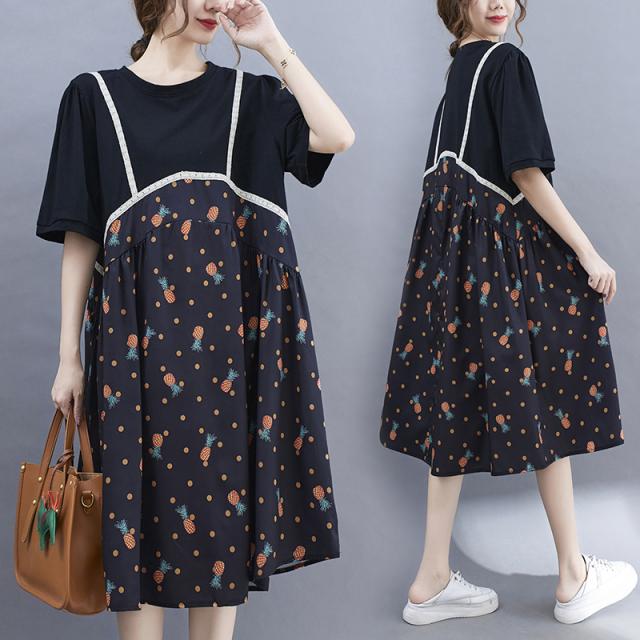 重ね着風 ドッキング Tシャツワンピース Tシャツ ワンピース 膝下 ミモレ ミモレ丈 袖あり 半袖 ラウンドネック 襟なし 切り替えデザイン ハイウエスト 異素材MIX かわいい 大人可愛い カジュアル 大人 おしゃれ お洒落 ルーズ 個性的 主役級 パイナップル柄 夏 10代 20代 レディース 通勤 学生 通学 デート お出かけ 公園デビュー 女子会 休日 旅行 着回し 普段使い 重ね着 韓国 コーデ 楽ちん 体系カバー ゆったり 大きいサイズ L XL 2XL 3XL 色展開 黒 ブラック