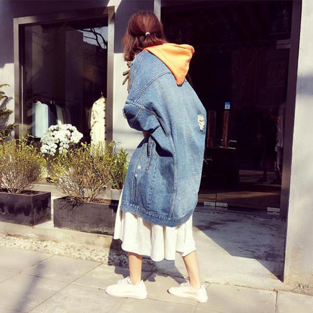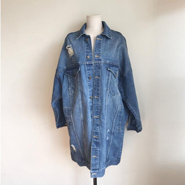 デニムオーバージャケット トップス ロング丈 長袖 襟付き デニム かわいい カジュアル ボーイッシュ 春 秋 冬 10代 20代 30代 レディース 学生 お出かけ 休日 普段使い 穴あき ワンサイズ ブルー