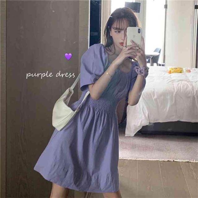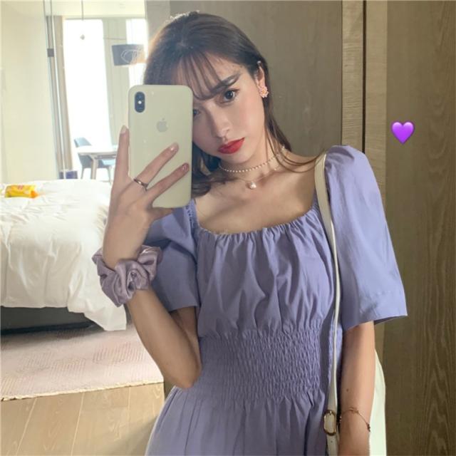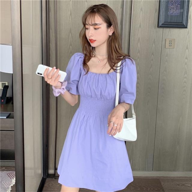 ワンピース スクエアネック パフ袖 パフスリーブ 半袖 袖あり ミニ丈 ひざ上 膝上 ハイウエスト 切り替え 伸縮性 ウエストゴム シャーリング くしゅくしゅ デザイン シンプル 無地 Aライン スウィート ラブリー ガーリー 大人可愛い かわいい 可愛い 大人女子 女の子 おしゃれ お洒落 通勤 通学 学生 お出かけ デート 旅行 休日 普段着 普段使い レディース 10代 20代 夏 S M L XL パープル 紫