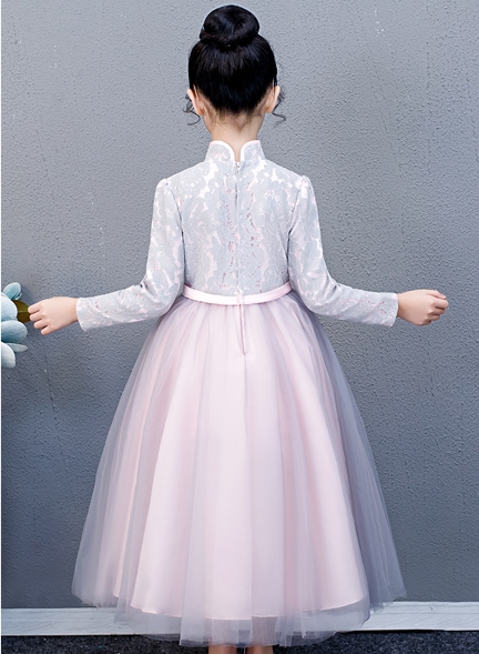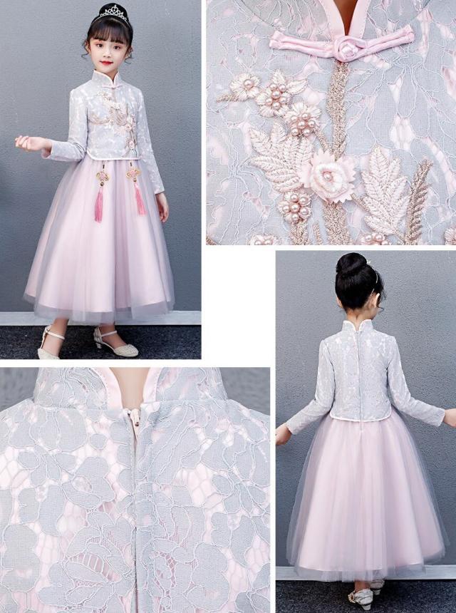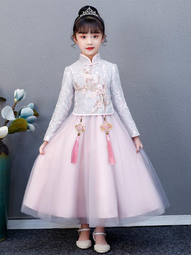 キッズ チャイナドレス プリンセス ドレス 衣装 お姫様 お嬢様 花柄 刺? レース ビジュー ビーズ 長袖 袖あり 襟付き 立ち襟 チュール ロング 膝下 ロング丈 Aライン ハイウエスト 切り替え ジッパー ファスナー タッセル ふんわり かわいい 可愛い キュート ラブリー 存在感 華やか 主役級 パーティー イベント 演奏会 発表会 舞台 ステージ 子供用 子供 子ども 女の子 10代 春 秋 冬 110cm 120cm 130cm 140cm 150cm 160cm グレーピンク